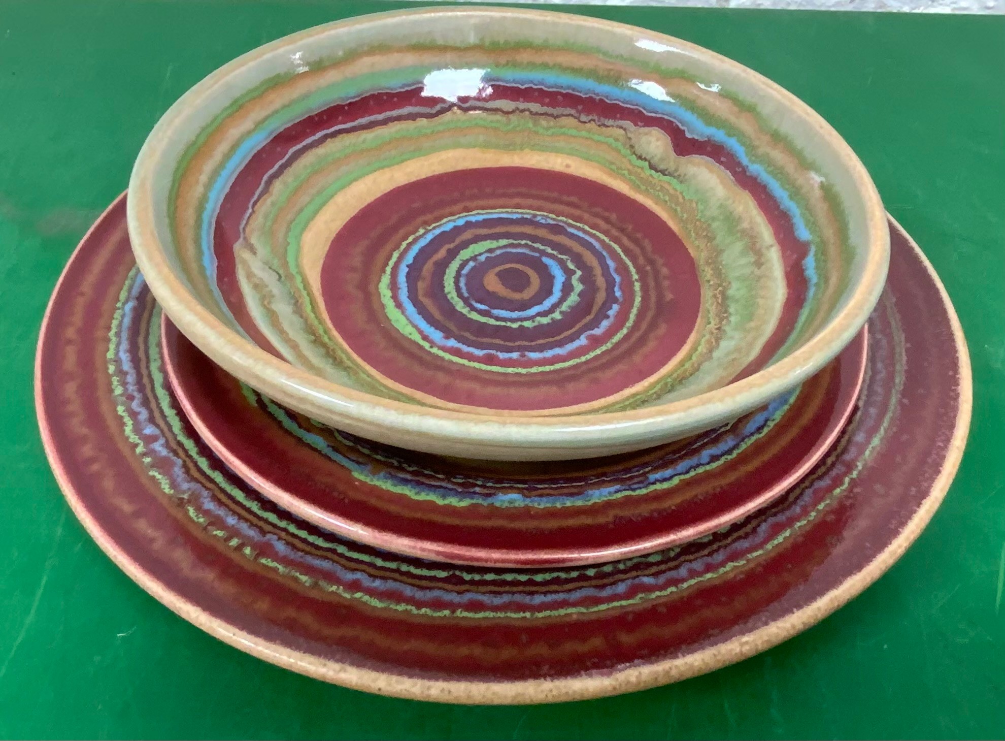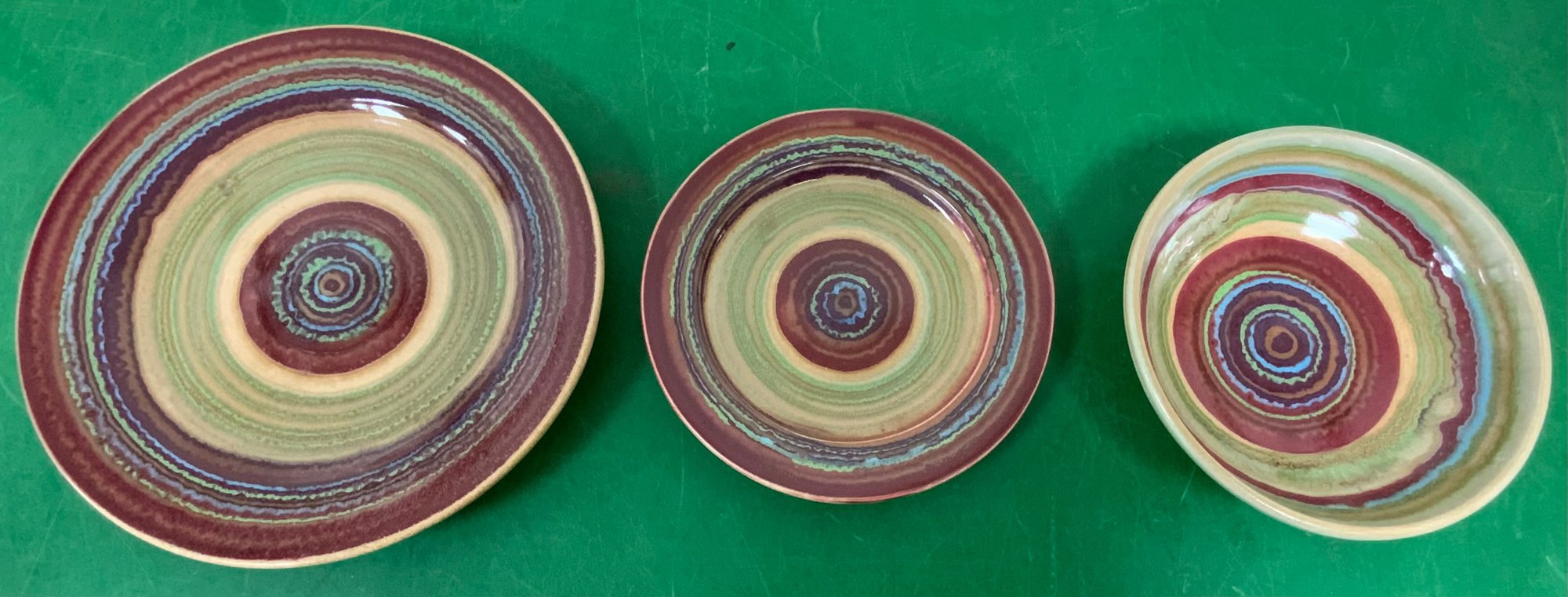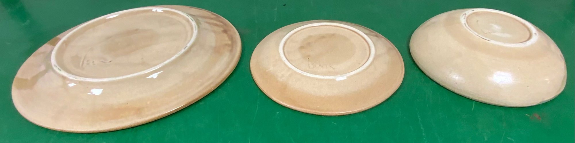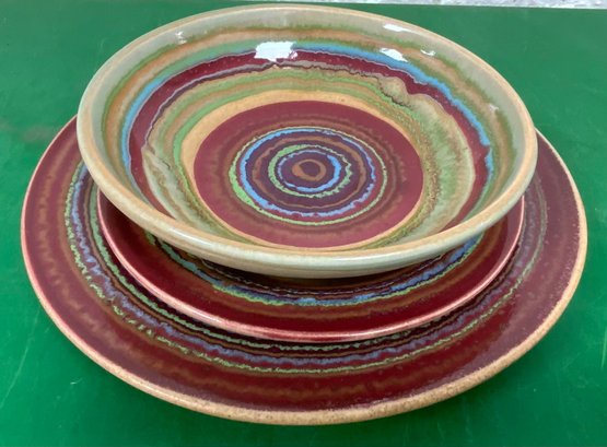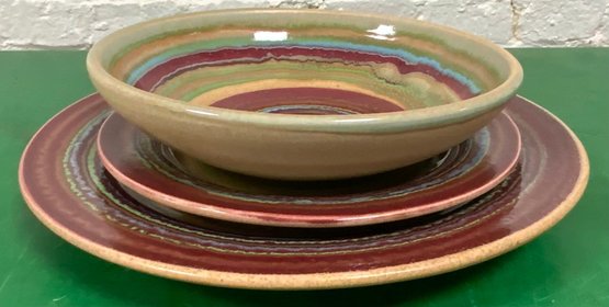 Disregard the white glare from the overhead lights. D. Lasser Ceramics 3 Piece Dinner Set (9). Very good condition. Set consists of a dinner plate, salad plate and a bowl. The entire Lasser collection is up for auction being sold separately, consisting of a total of 10 dinner sets, a pie plate, a large vase, a pitcher and a large platter. One of the 10 dinner sets does not include a bowl.