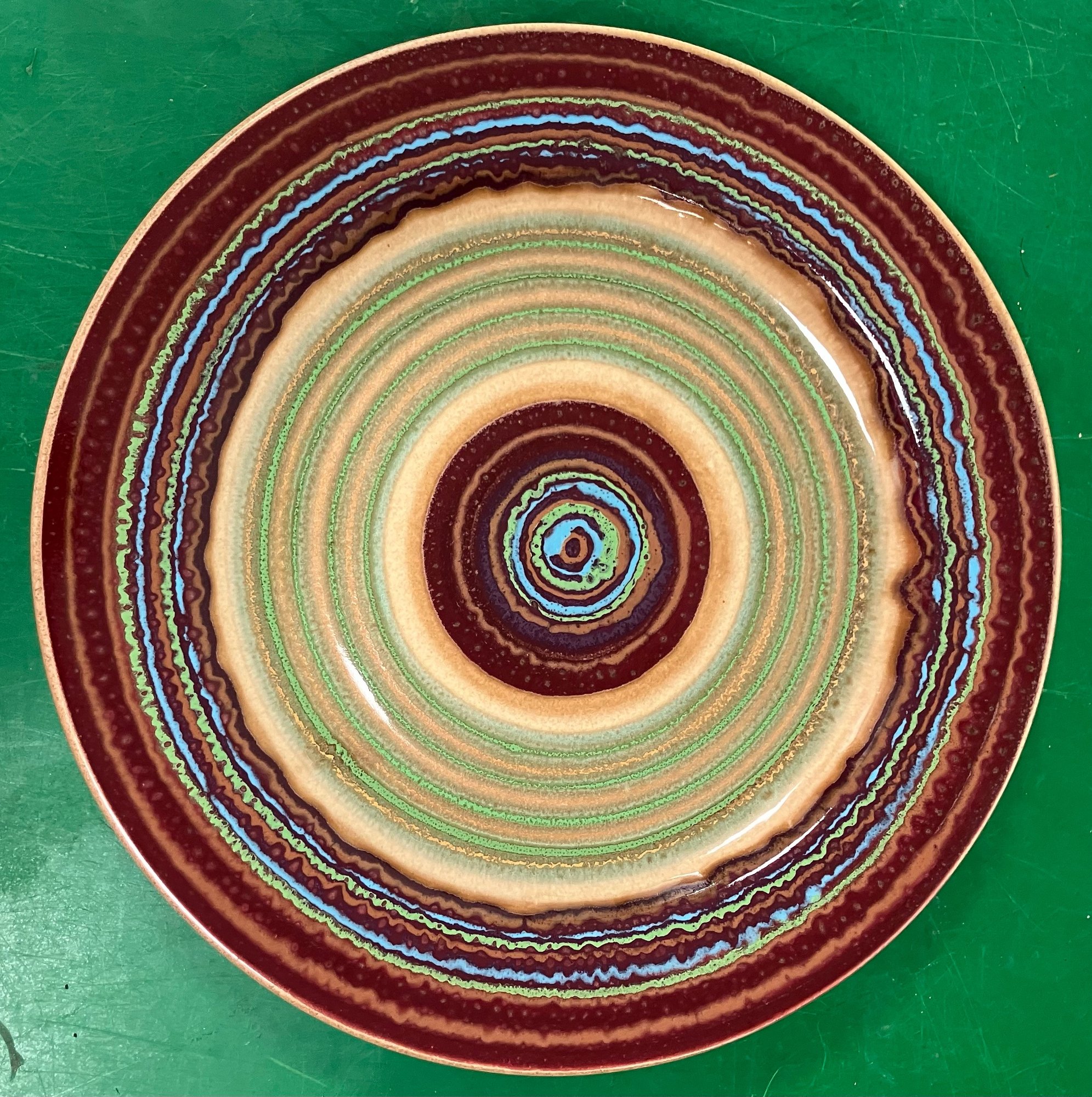 Disregard the white glare from the overhead lights. D. Lasser Ceramics large platter. Very good condition. Dimensions are: 15 1/2” round. Photos of the entire set are on this lot.
