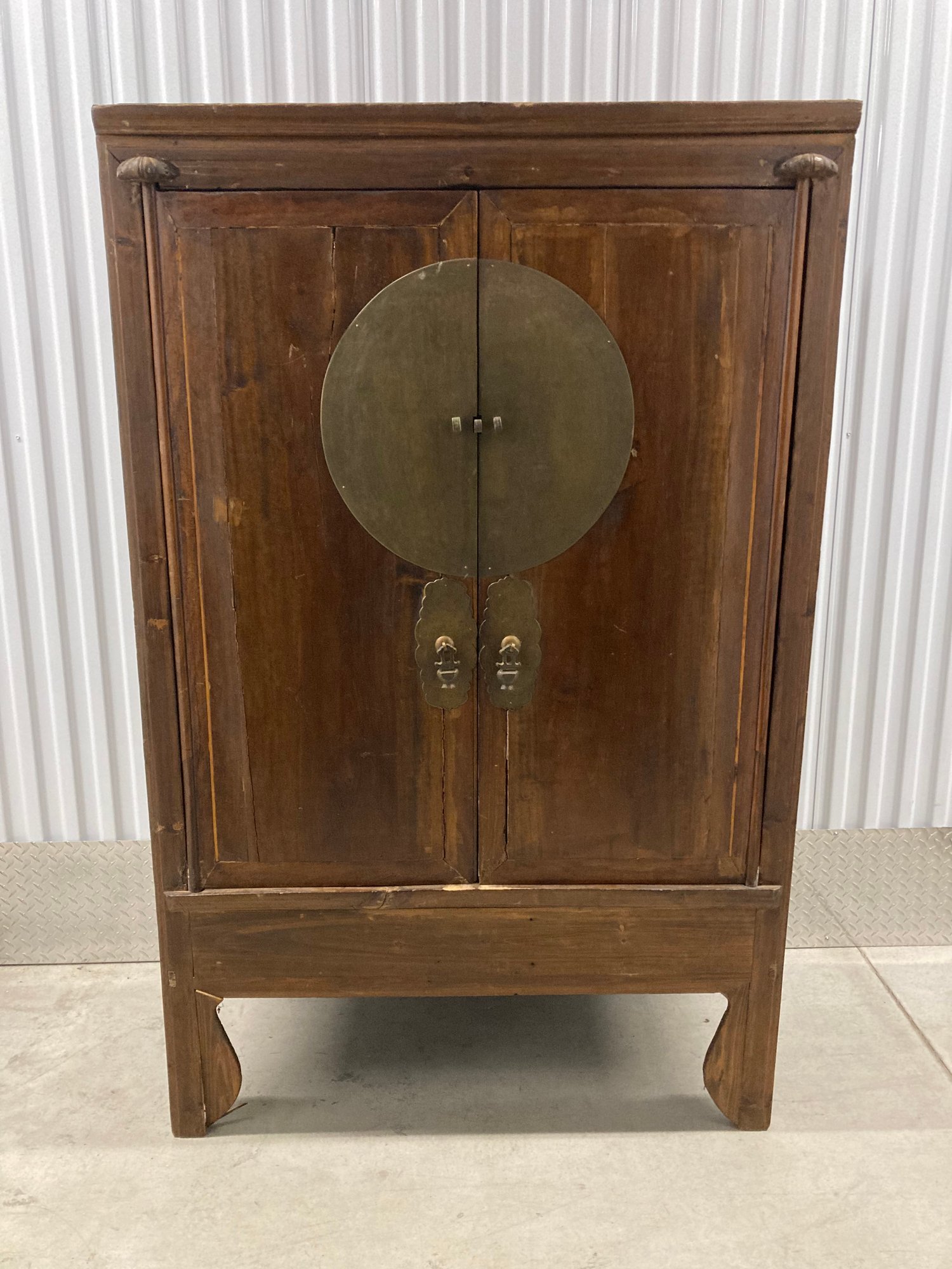 DIMENSIONS ADDED. Chinese Antique Wedding Cabinet. It has brass hardware and exotic woods. There are two drawers above a shelf. Dimensions are: 67 3/4” tall x 43 1/2” wide x 23 1/2” deep. Condition: See photos.