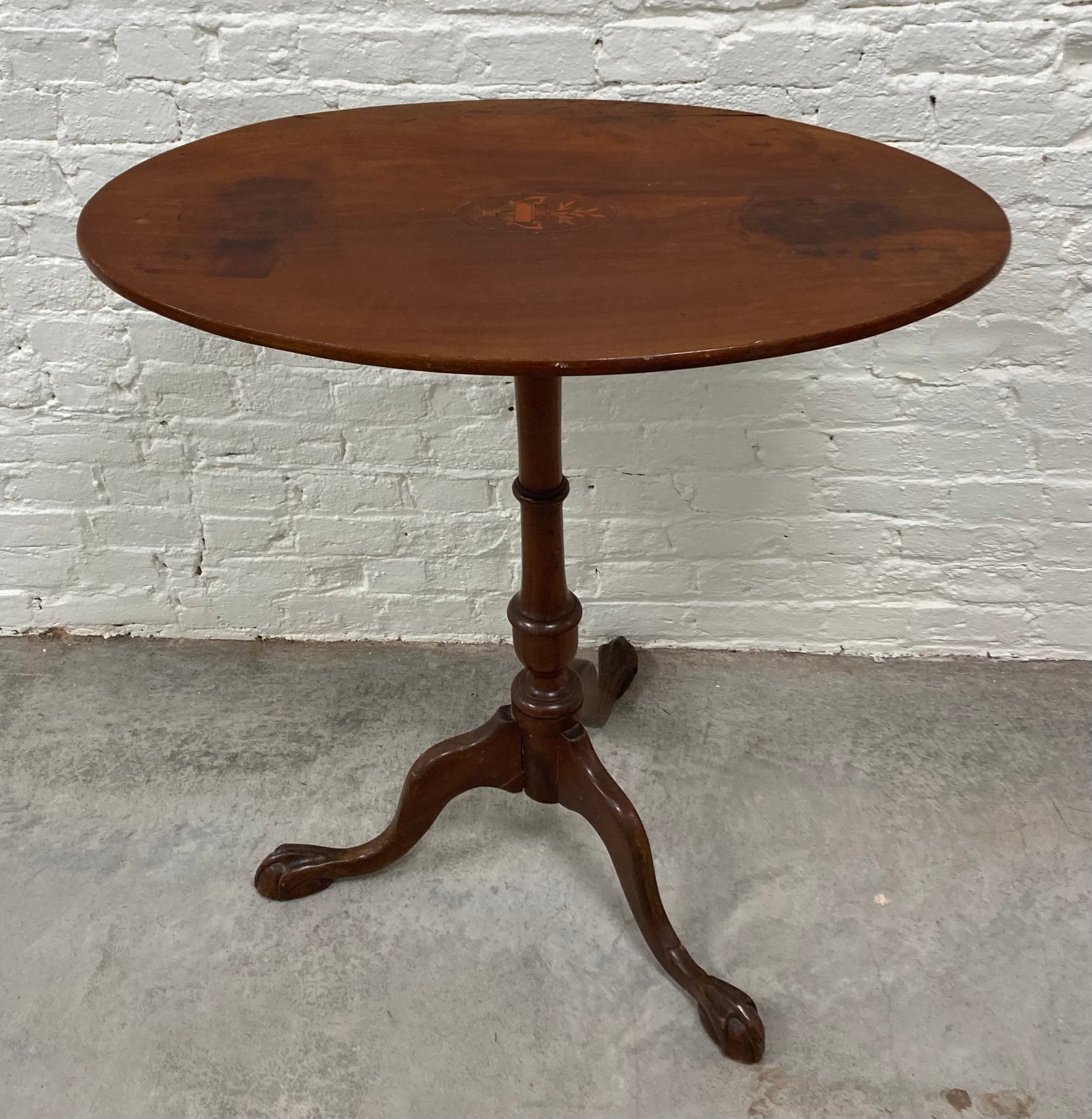 Period mahogany tilt top table with center inlay medallion. Circa 1780. Dimensions with top tilted are: 42 1/2” tall. Dimensions with top flat are: 29” tall x 27” long x 16” deep. Condition: Table top has a split and a foot was repaired. See photos.