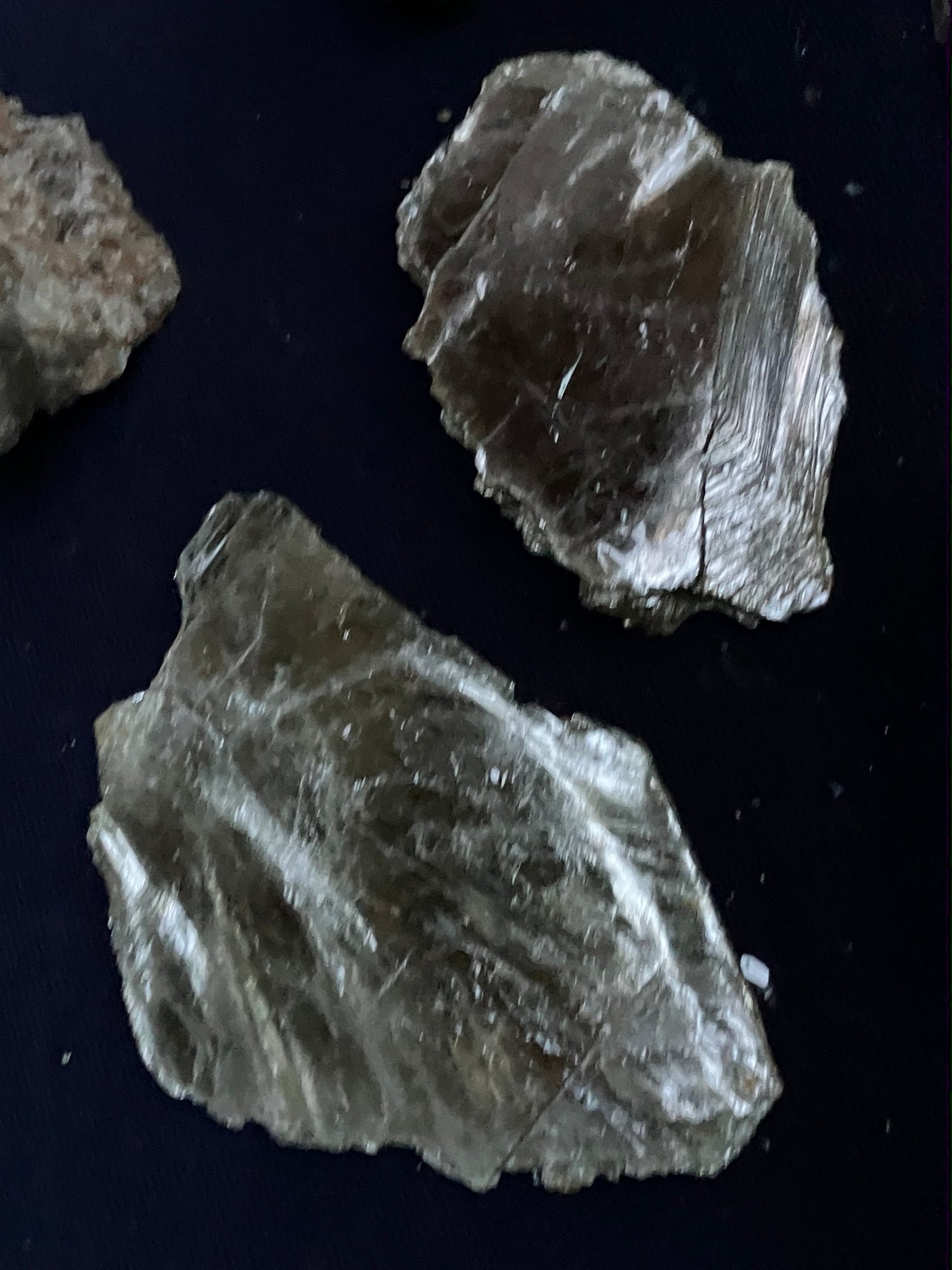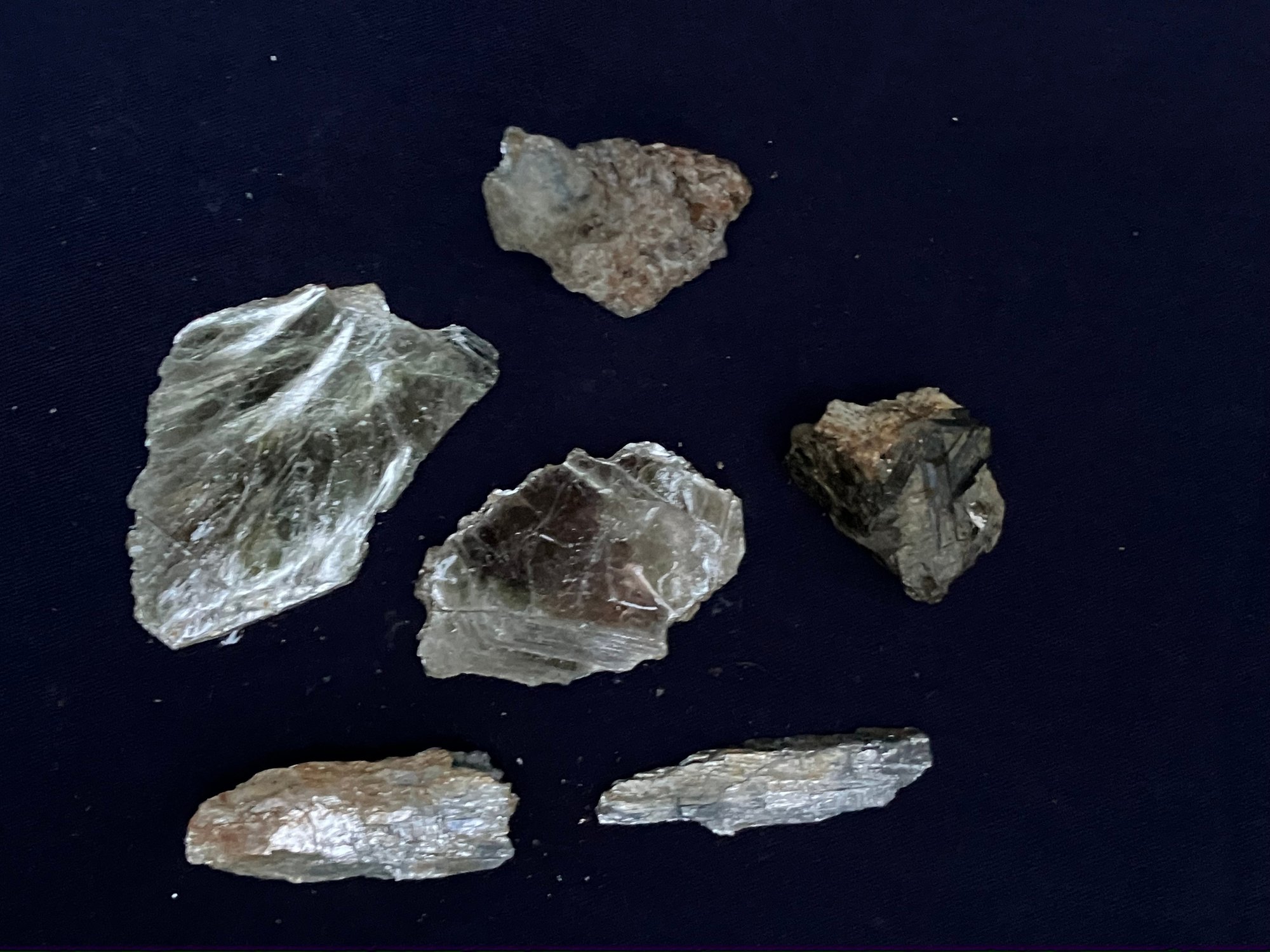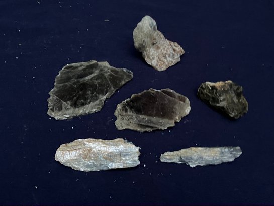 The assortment contains Muscovite with black tourmaline, two sheets of Muscovite and two specimens of kyanite, one of which is a blade, the other is in Quartz matrix. Longest piece measures: 3” tall x 2” wide.20