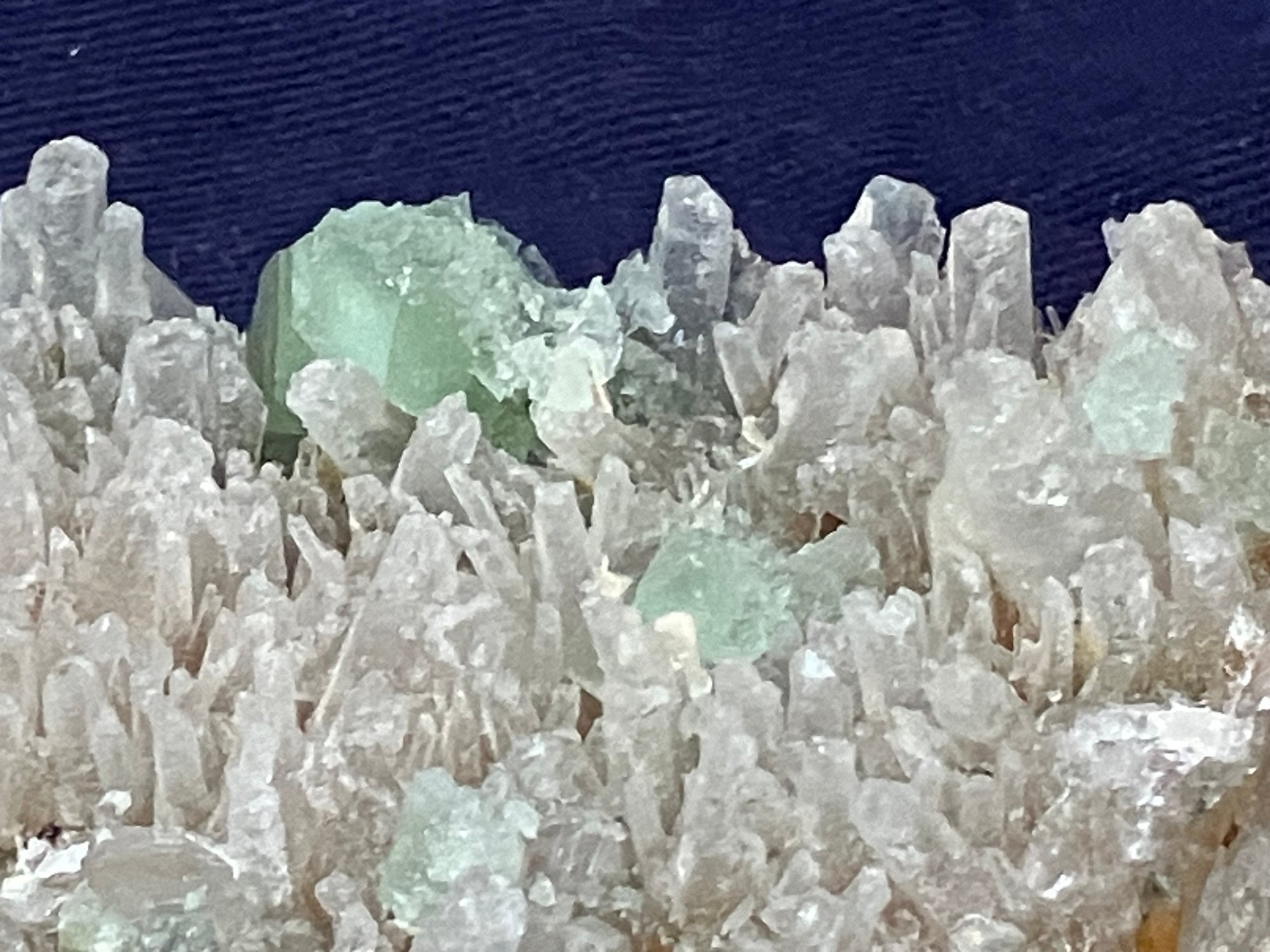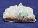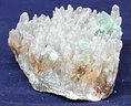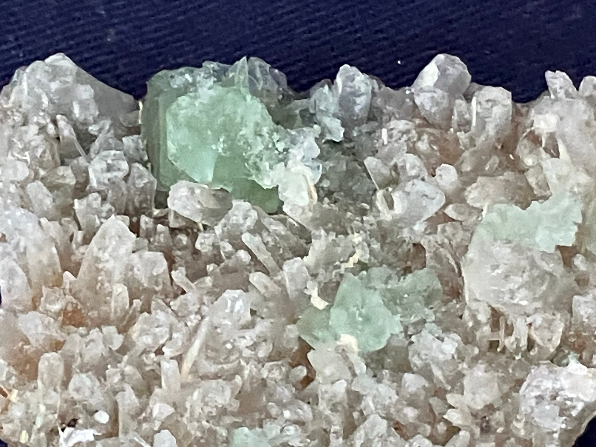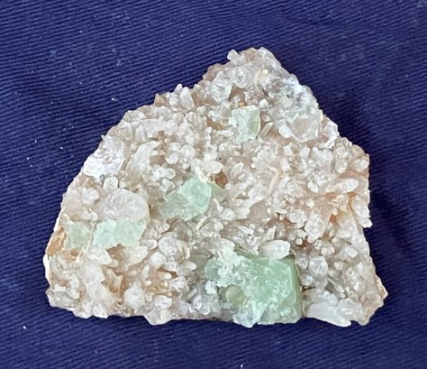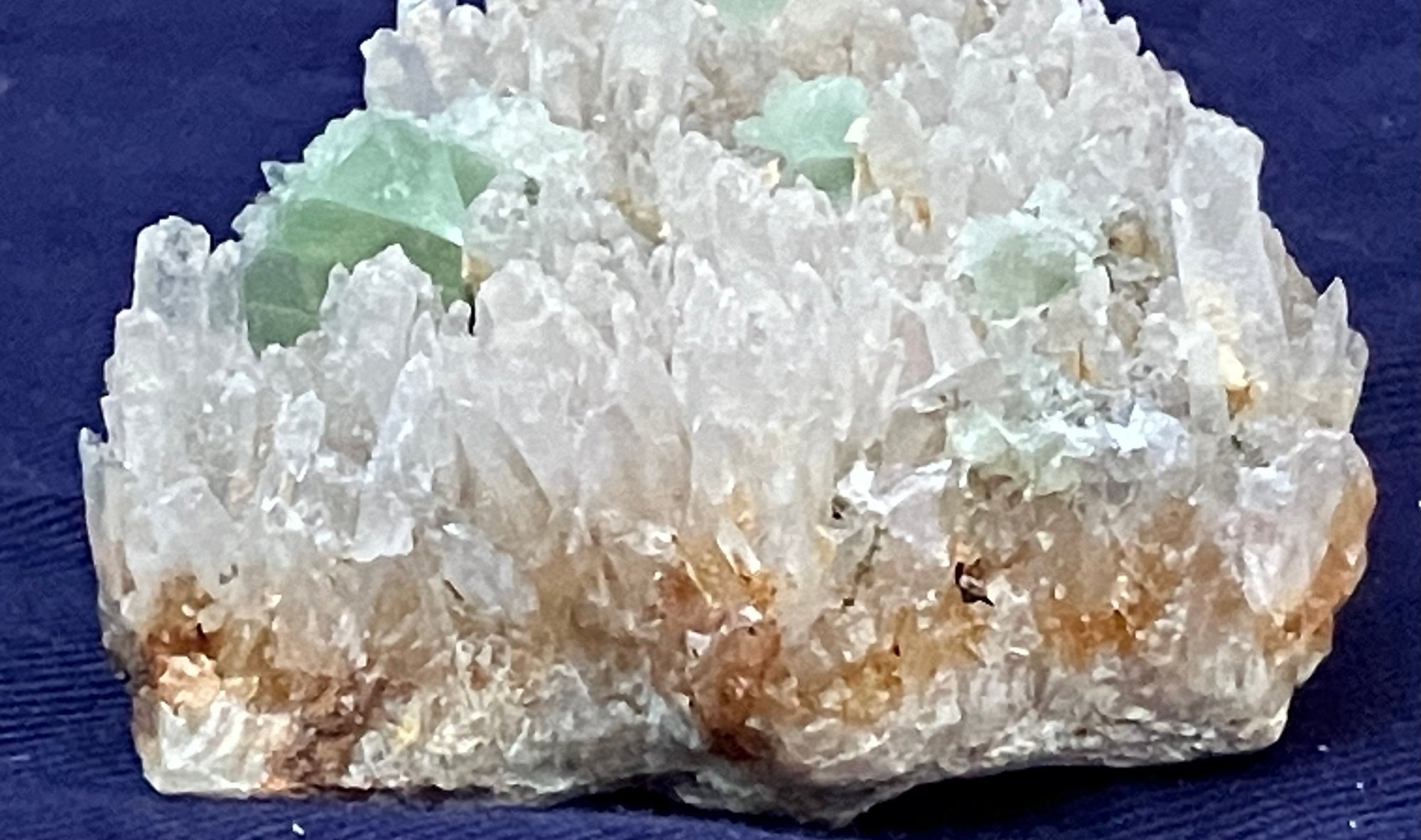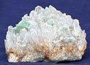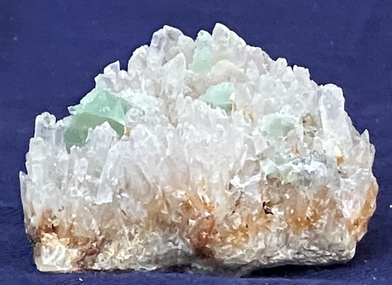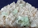 Nice combination of green fluorite on a quartz plate. Measures: 1” tall x 2” wide x 2 1/4” long. Weighs: 2.8 ounces.