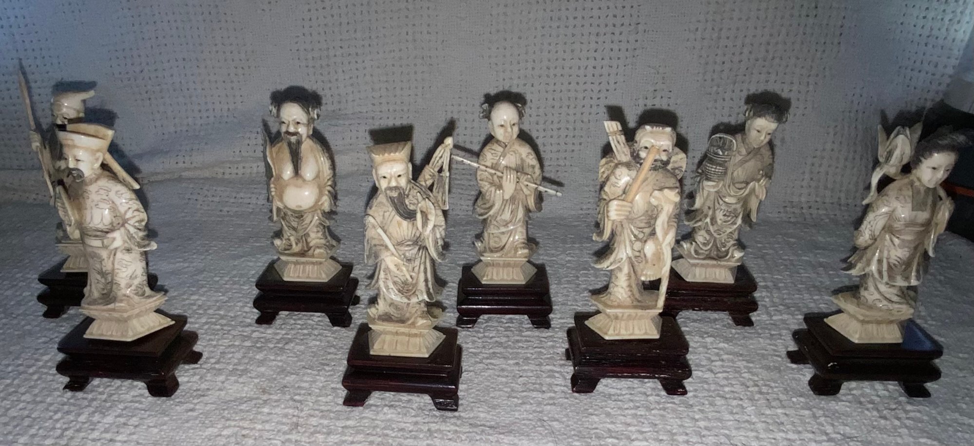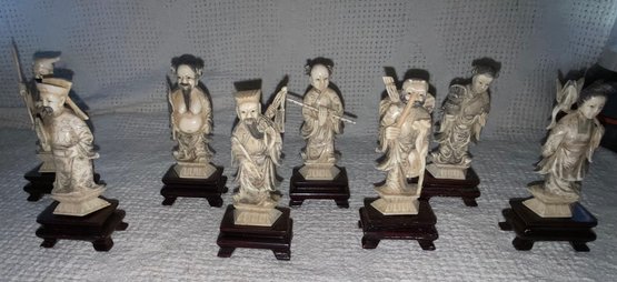 **UPDATED INFORMATION** THIS ITEM WAS FORMALLY APPRAISED. THEY ARE NOT A RESIN. Possibly bone, horn or other natural material. The dimensions are: 3 1/4” tall and with the base it is: 4” tall. 8 Immortals. Good condition.