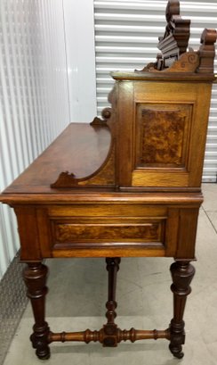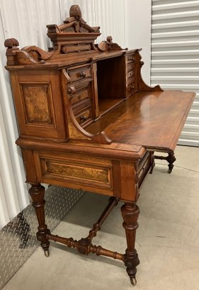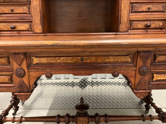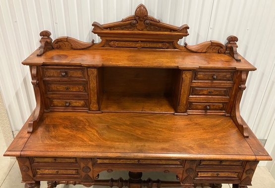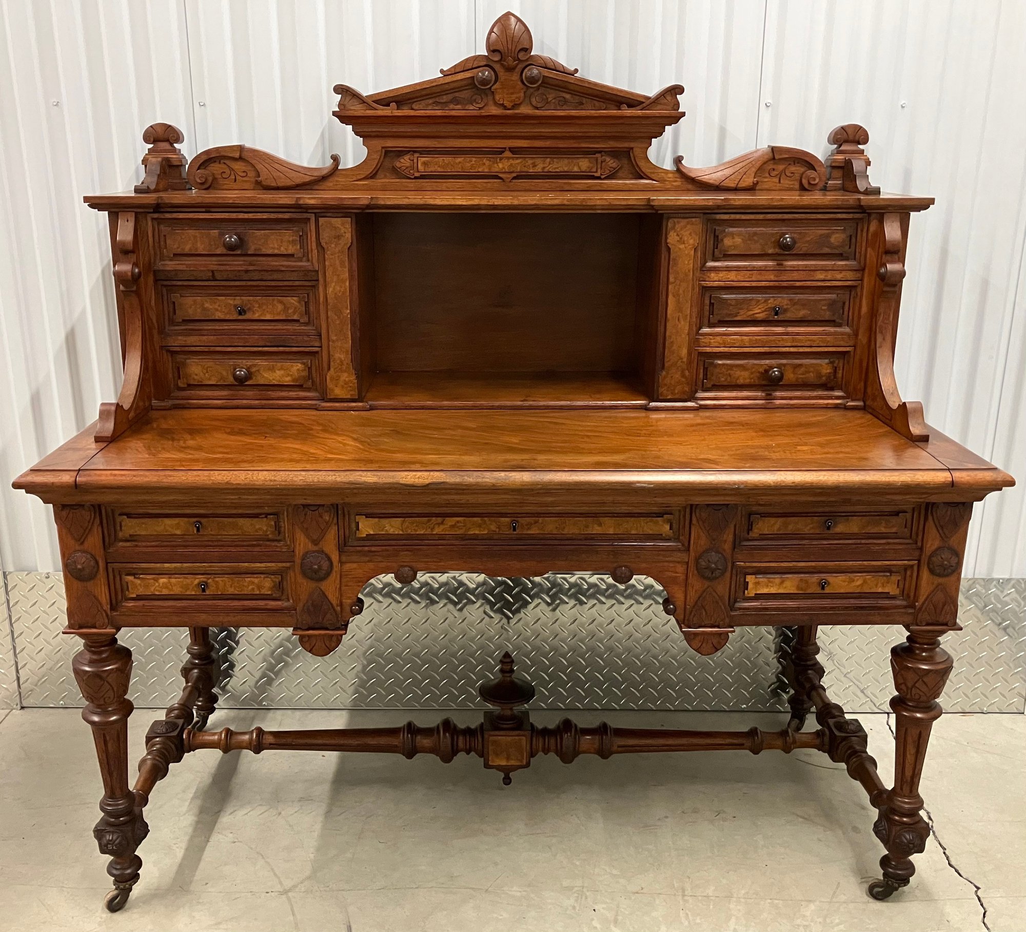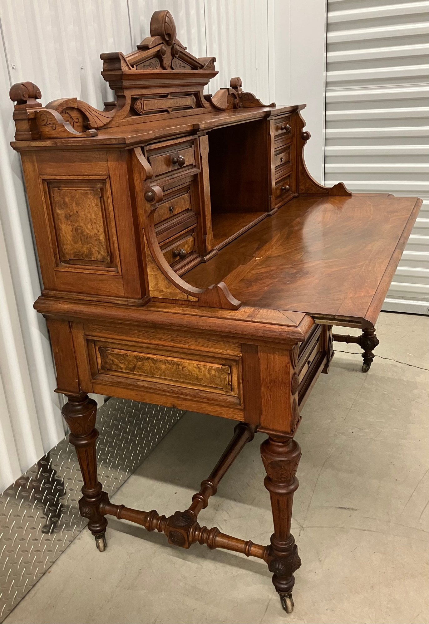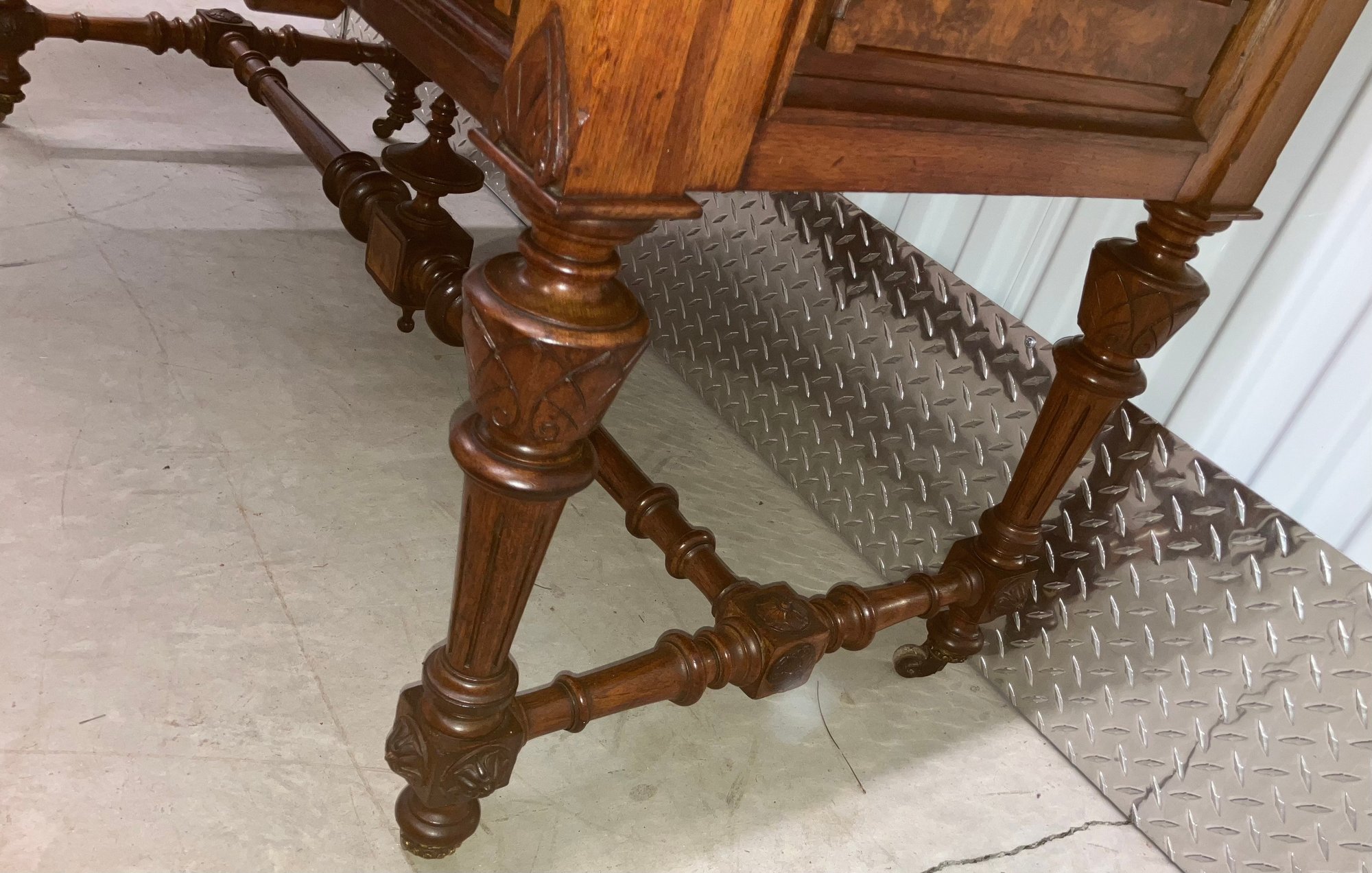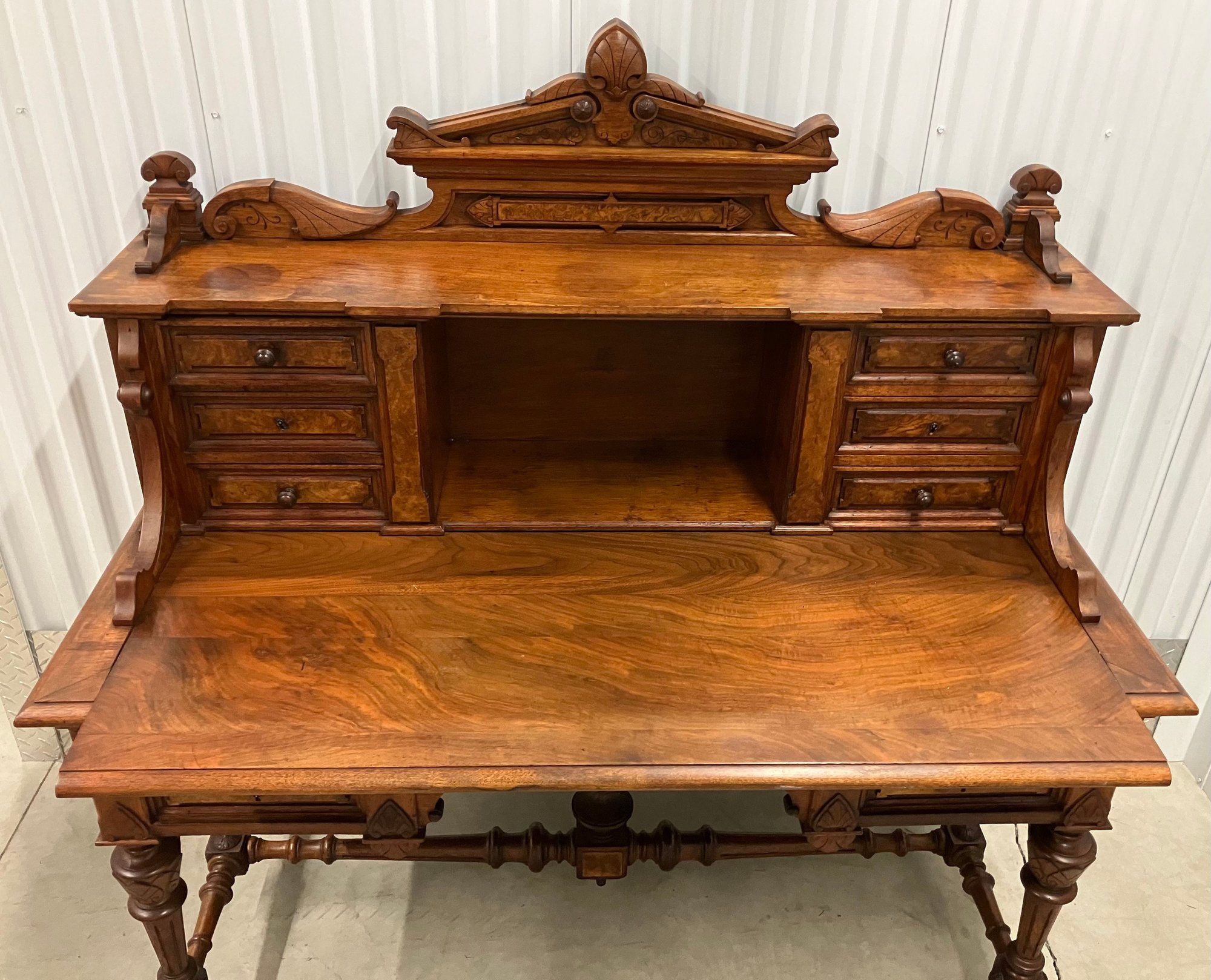 This is a fine American Walnut Renaissance Revival Desk c. 1865. The desk is made of walnut with raised burl panels with intricate carvings. It is a rare trestle desk form. The writing surface mechanically extends out, creating a larger writing surface. It is a very high quality desk in excellent condition.