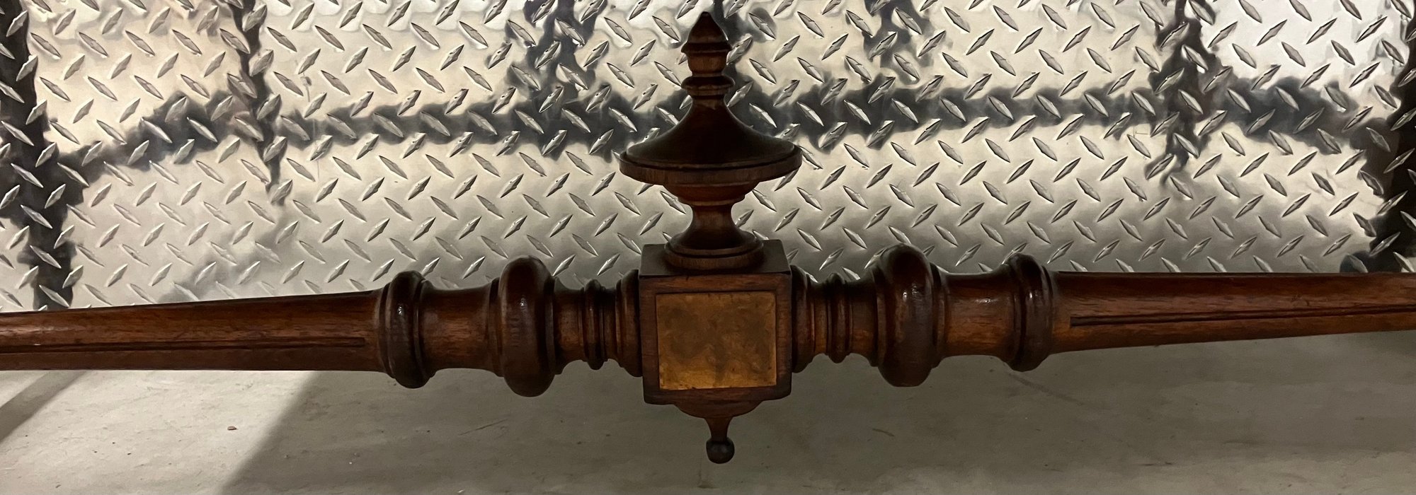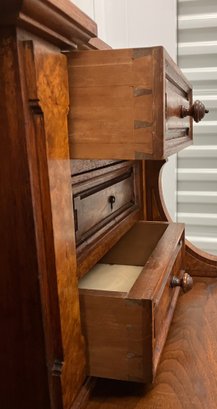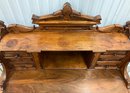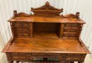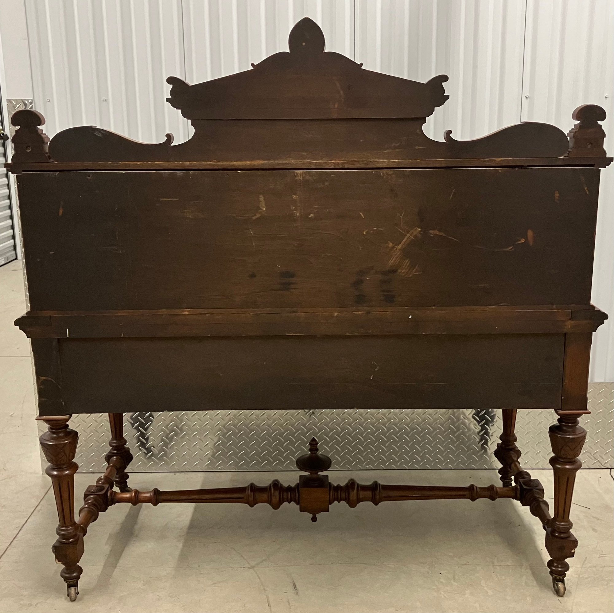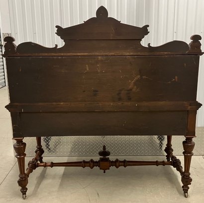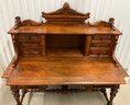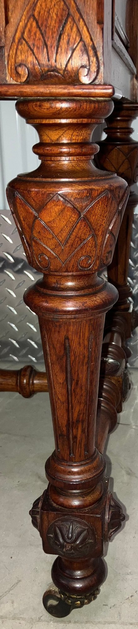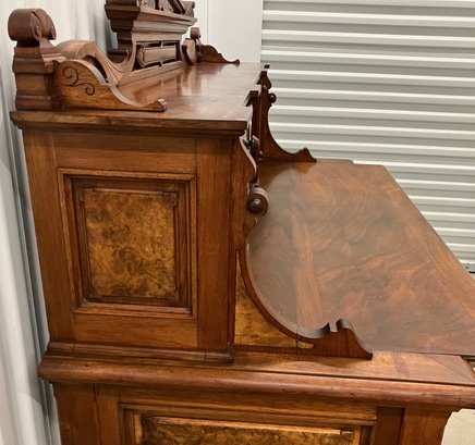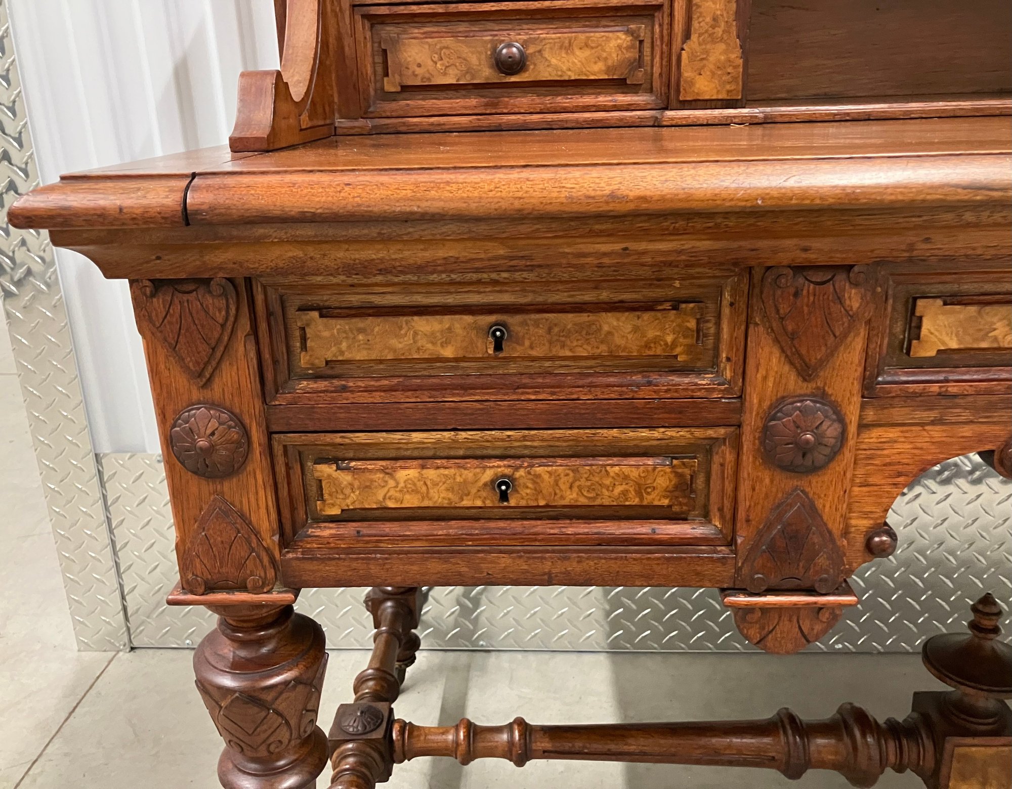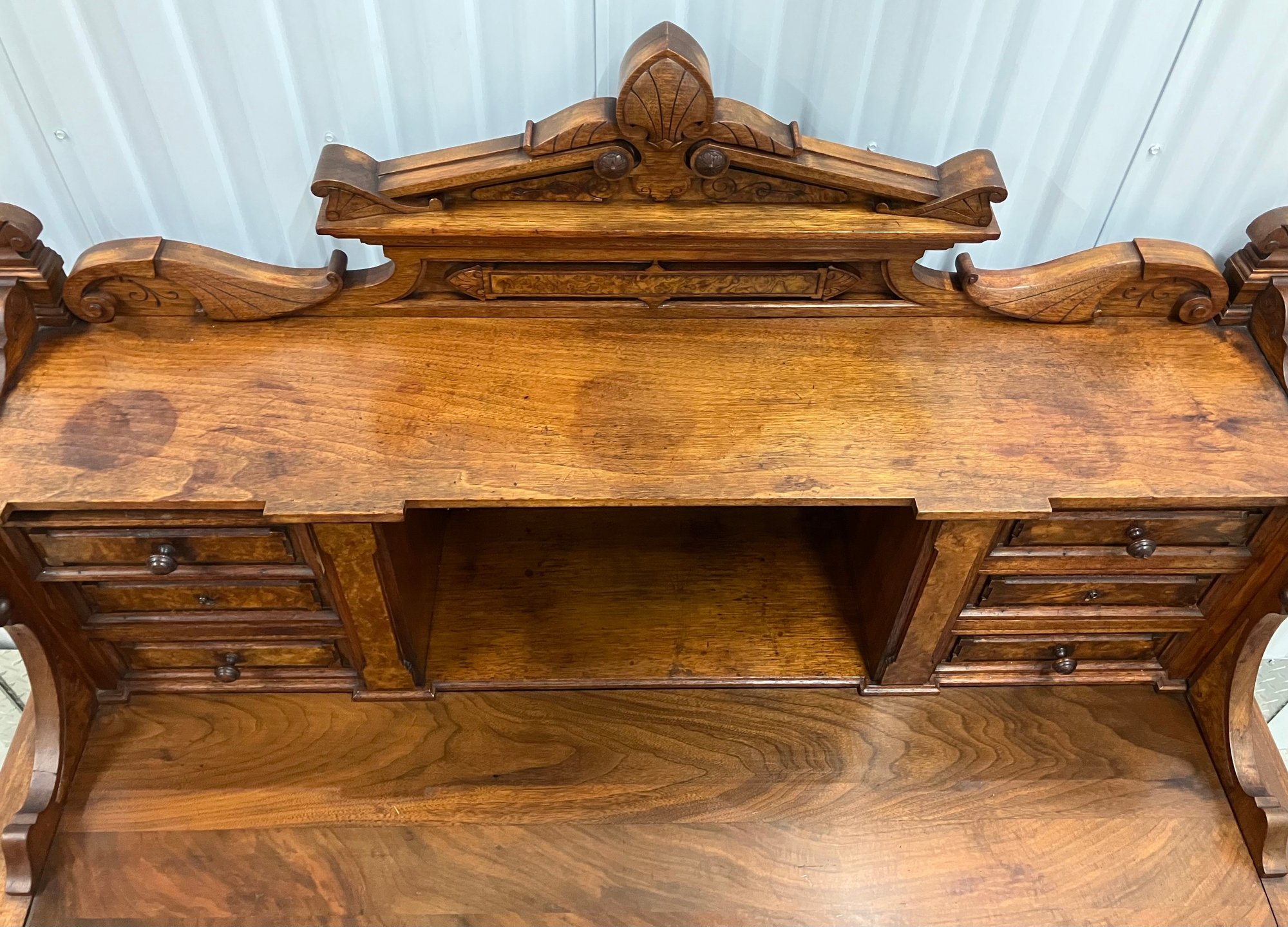 This is a fine American Walnut Renaissance Revival Desk c. 1865. The desk is made of walnut with raised burl panels with intricate carvings. It is a rare trestle desk form. The writing surface mechanically extends out, creating a larger writing surface. It is a very high quality desk in excellent condition.
