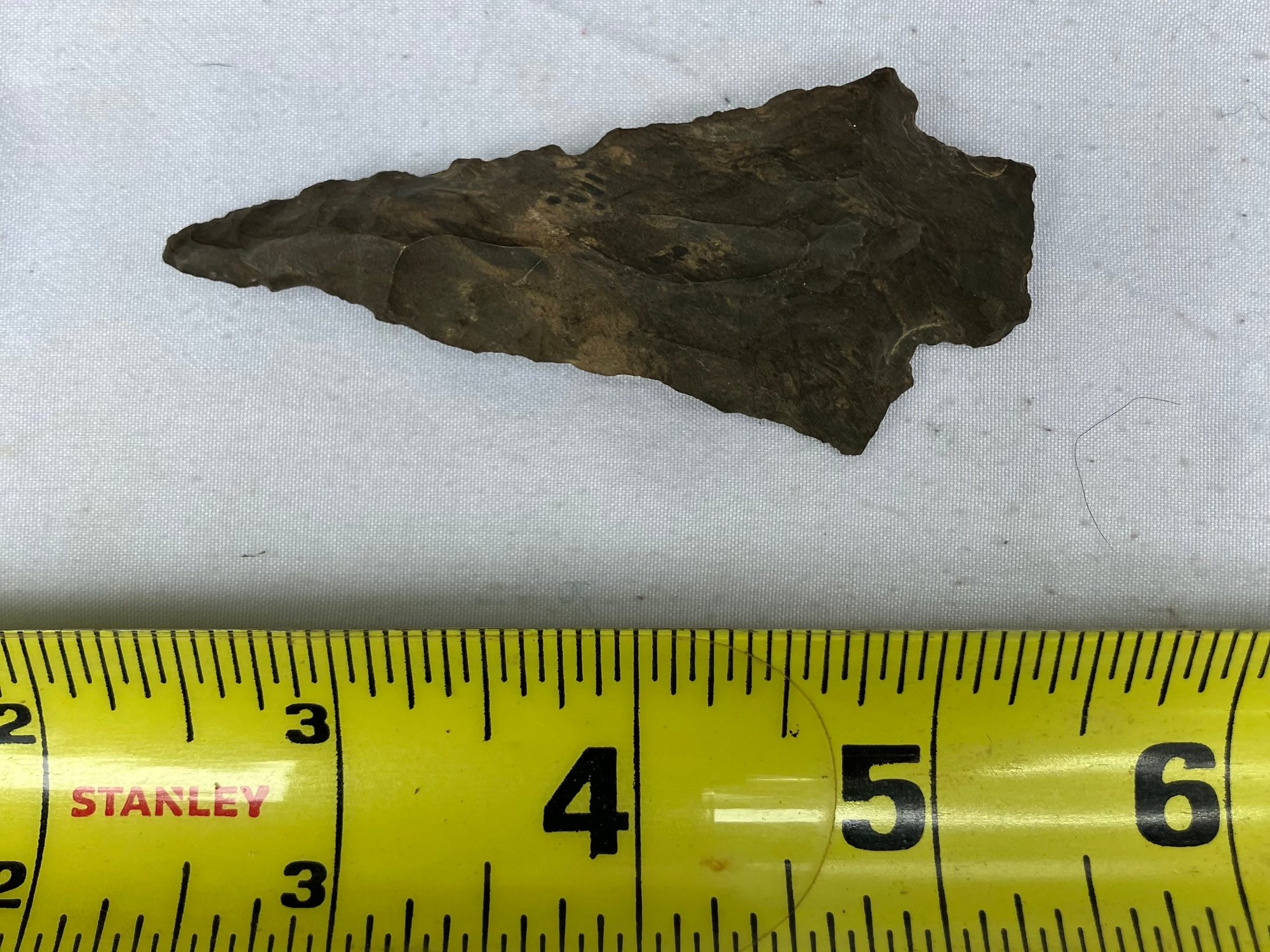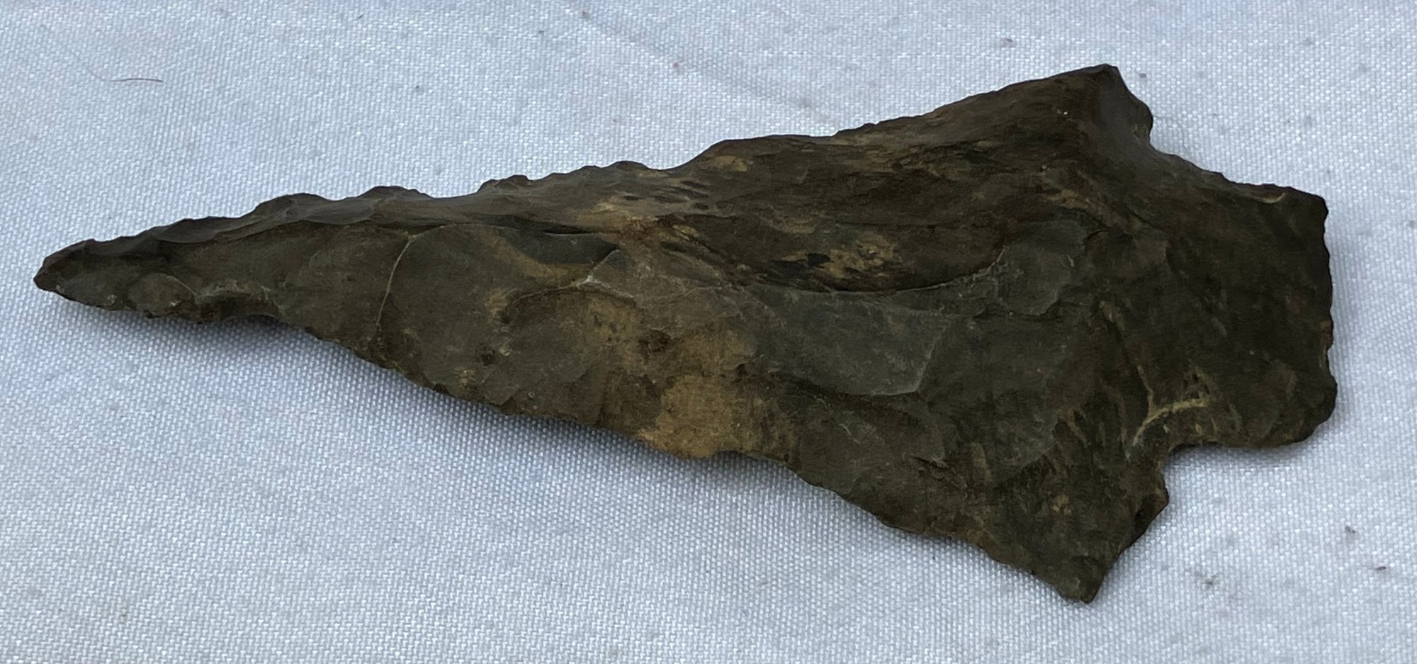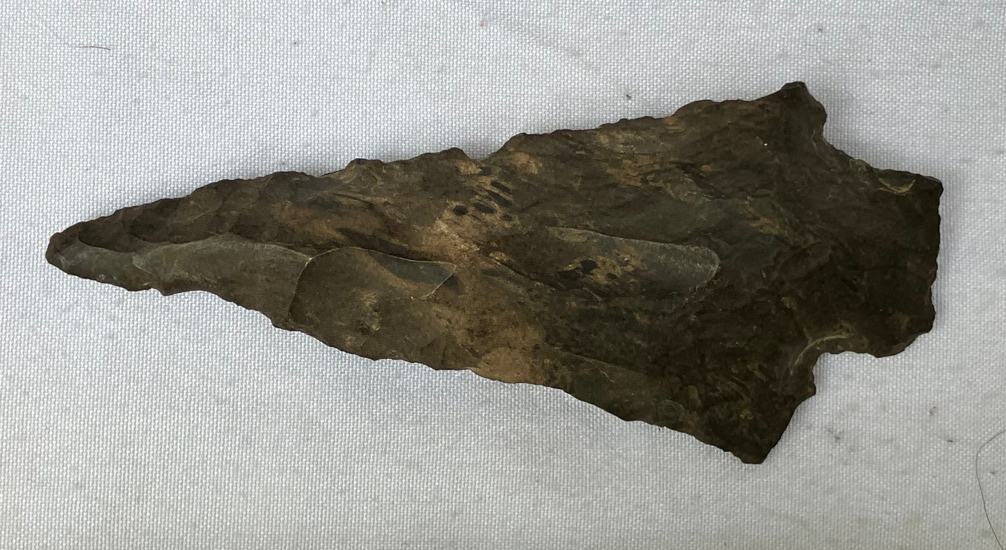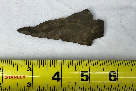 Found at a Native American dig site. Flint bi-facial with a very slender point possibly used for a drill.