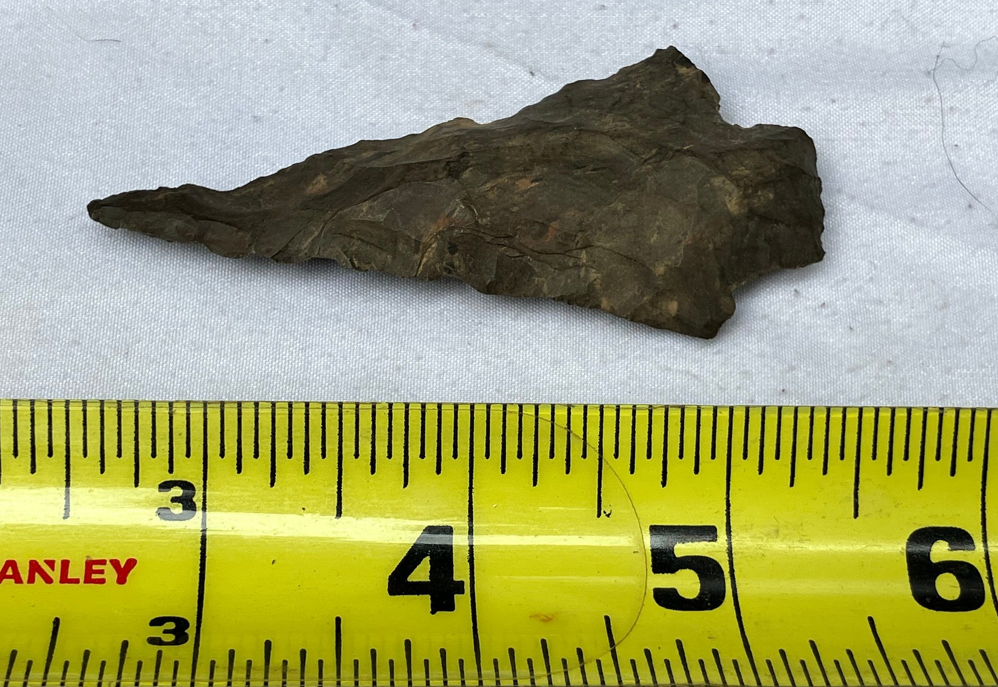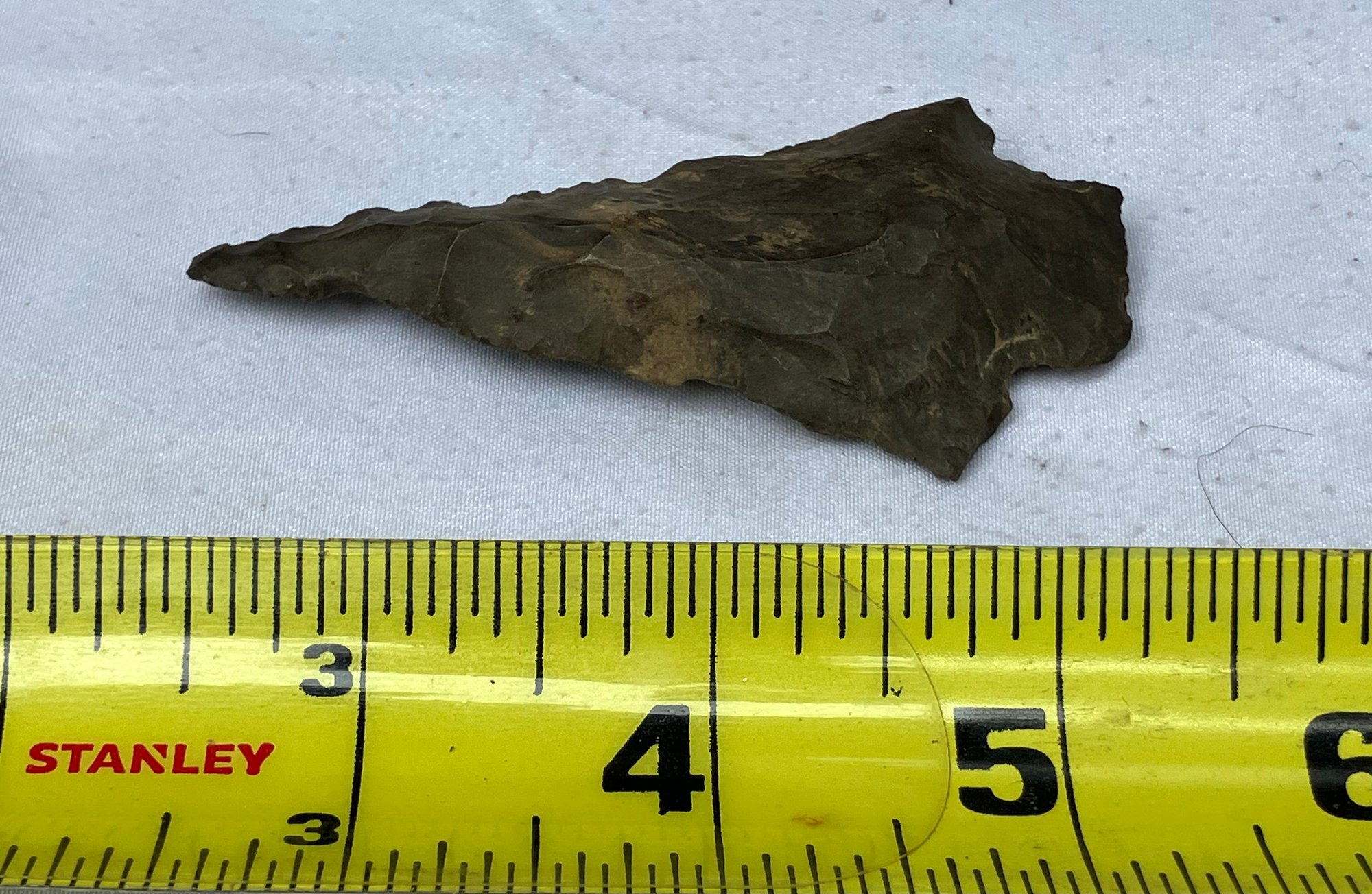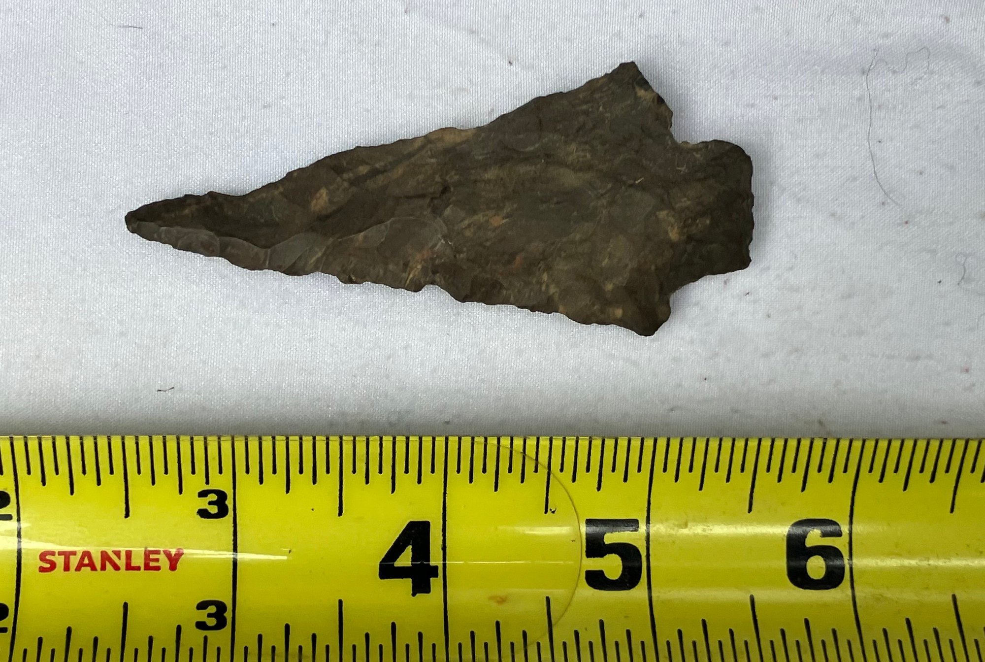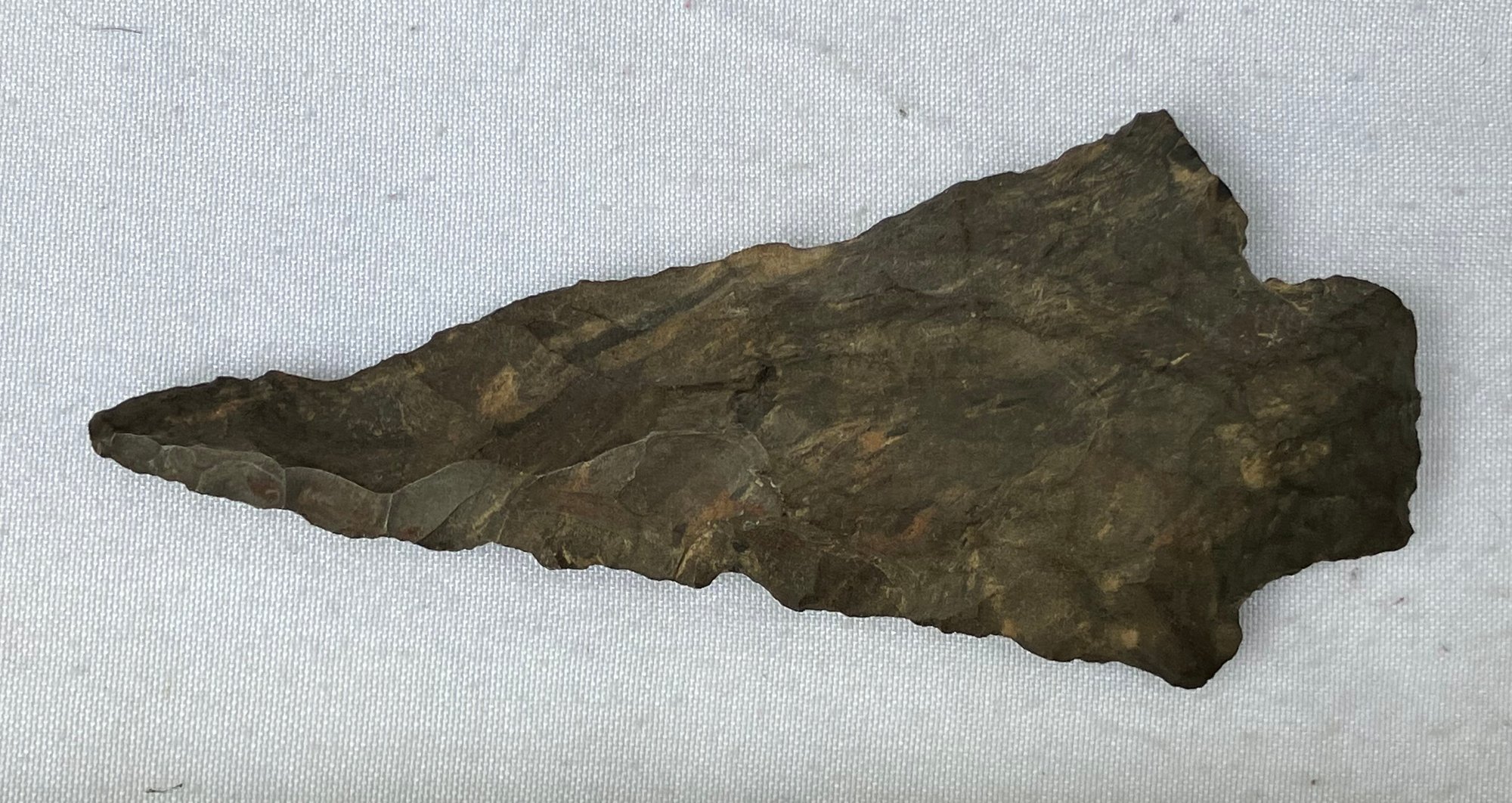 Found at a Native American dig site. Flint bi-facial with a very slender point possibly used for a drill.