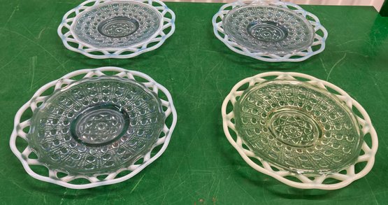 Four Frosted Glass Reticulated Plates. Dimensions are: 7” round. Good condition. No chips.