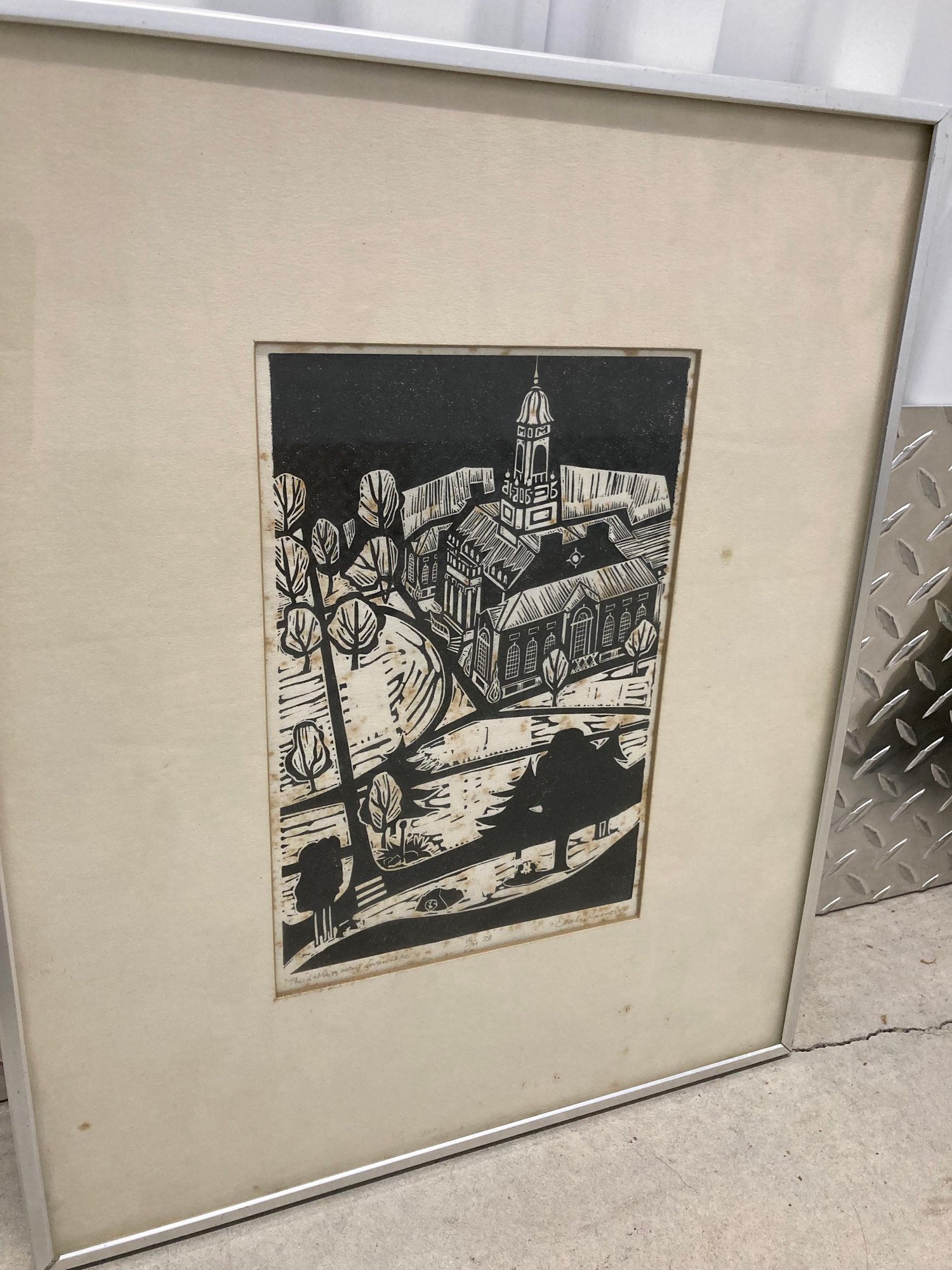 Framed Edith Spencer Signed Etching. “The library across Swan Lake”. It is number 12/100 ‘73. Has flowing. Dimensions of the etching are: 8” tall x 10” wide. Fair condition.