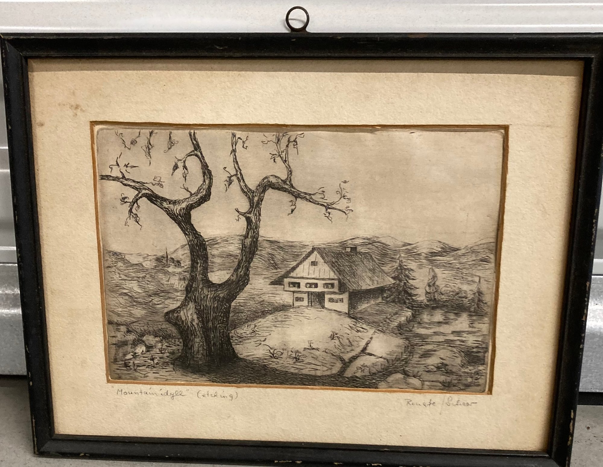 Framed Etching Mountain Idyll Signed Rougle/Scheer. Dimensions are: Fair to good condition.