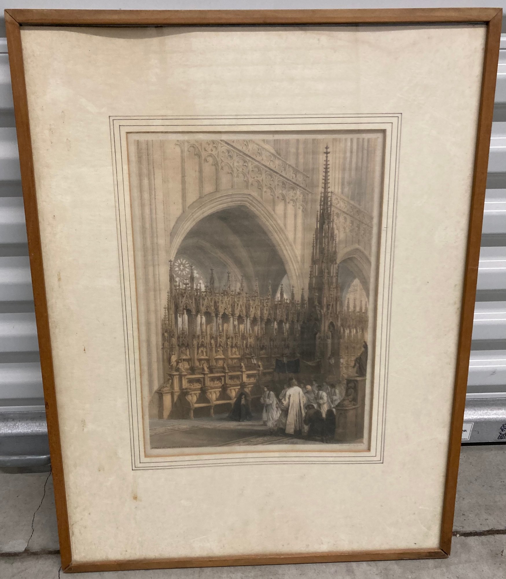 Framed Etching Of Cathedral. “Stalls In The Cathedral Antwerp”. “Day & Son Lith To The Queen”. Some coloring. Fair condition.