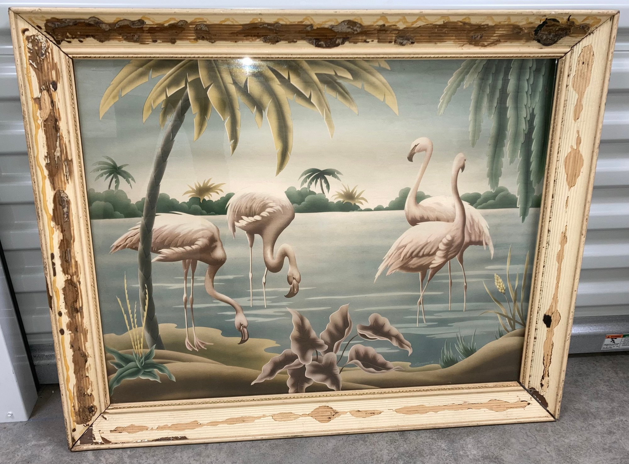 Framed flamingo print. Frame dimensions are: 26 1/2” tall x 33” wide. Print dimensions: 22” tall x 28” wide. Condition: Edge of frame is missing glass. See photos.