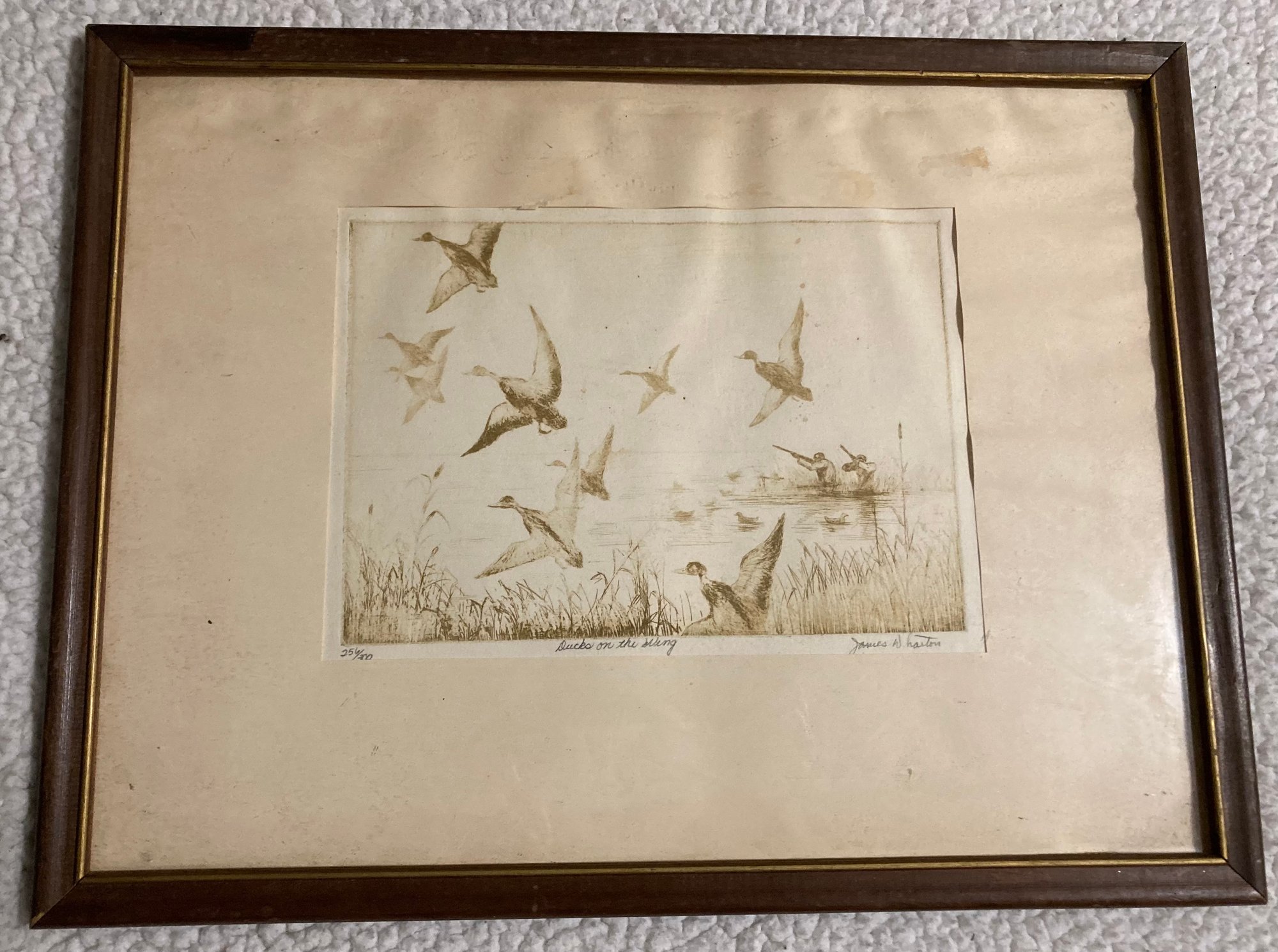 Framed Lithograph 256/300 Signed By James W. Barton. “Ducks On The Wing”. Dimensions are: 7” X 9.5”. Fair condition.