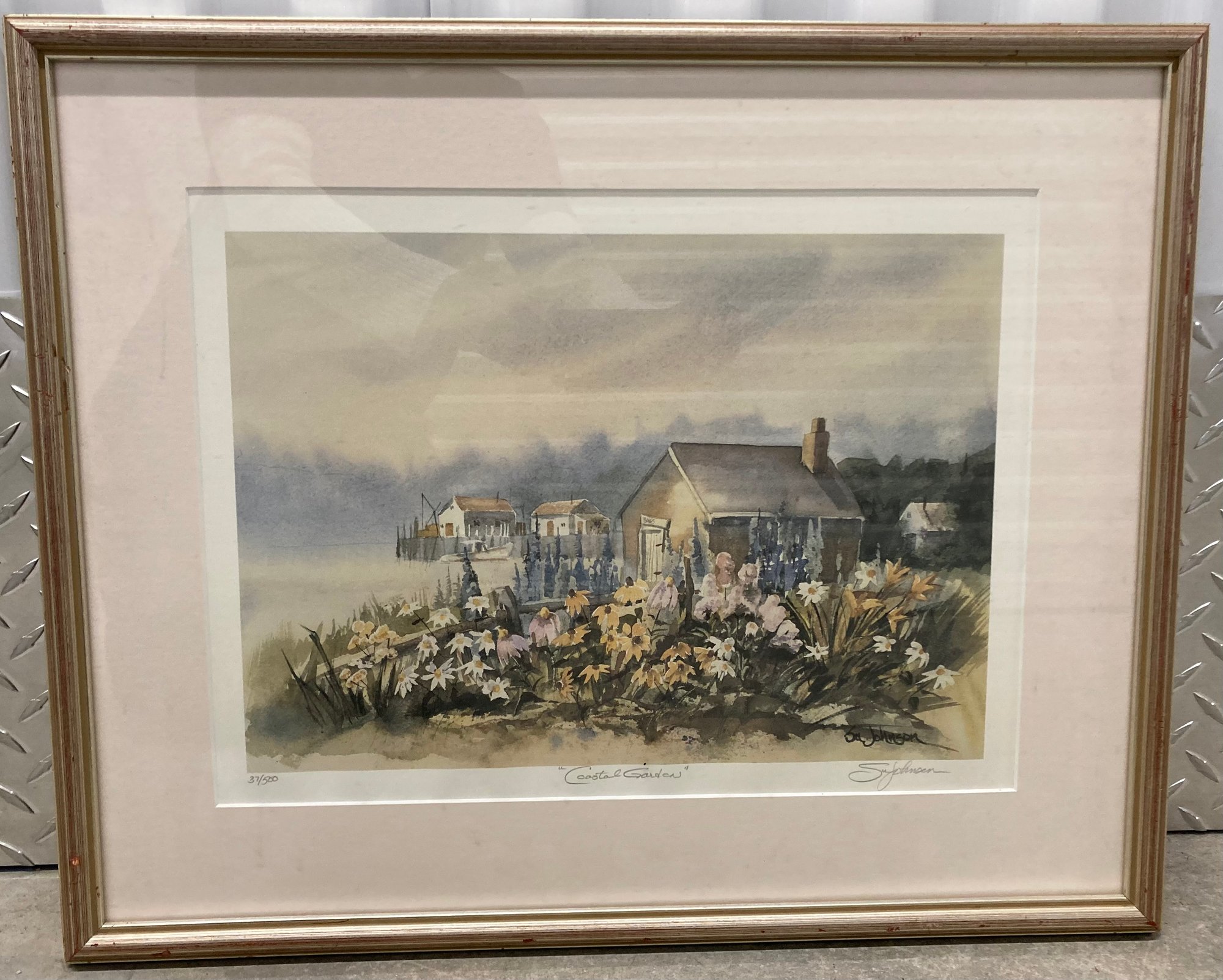 Framed Lithograph “Coastal Gardens”. Dimensions are: 11 1/2” tall x 15” wide. Good condition.