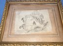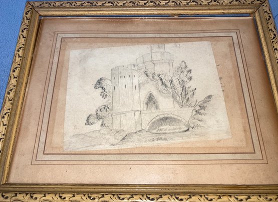 Framed pencil drawing of castle. Frame dimensions are: 6 3/4” tall x 8 3/4” wide. Pencil drawing dimensions: 3 1/2” tall x 5” wide. Condition: See photos.