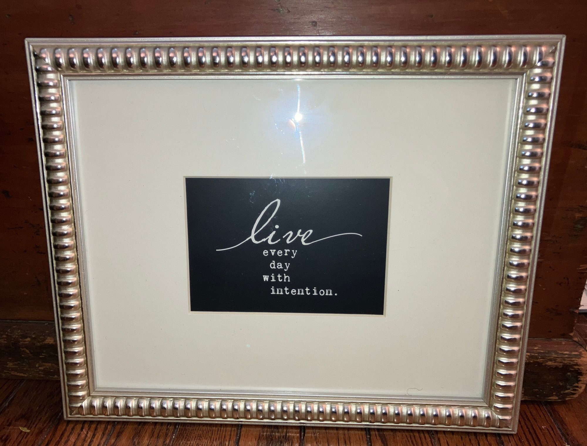 Framed print with the saying, “Live Everyday With Intention”. Dimensions: frame: 13” tall x 16” wide, print dimensions: 5” tall x 6 1/2” wide. Good condition.