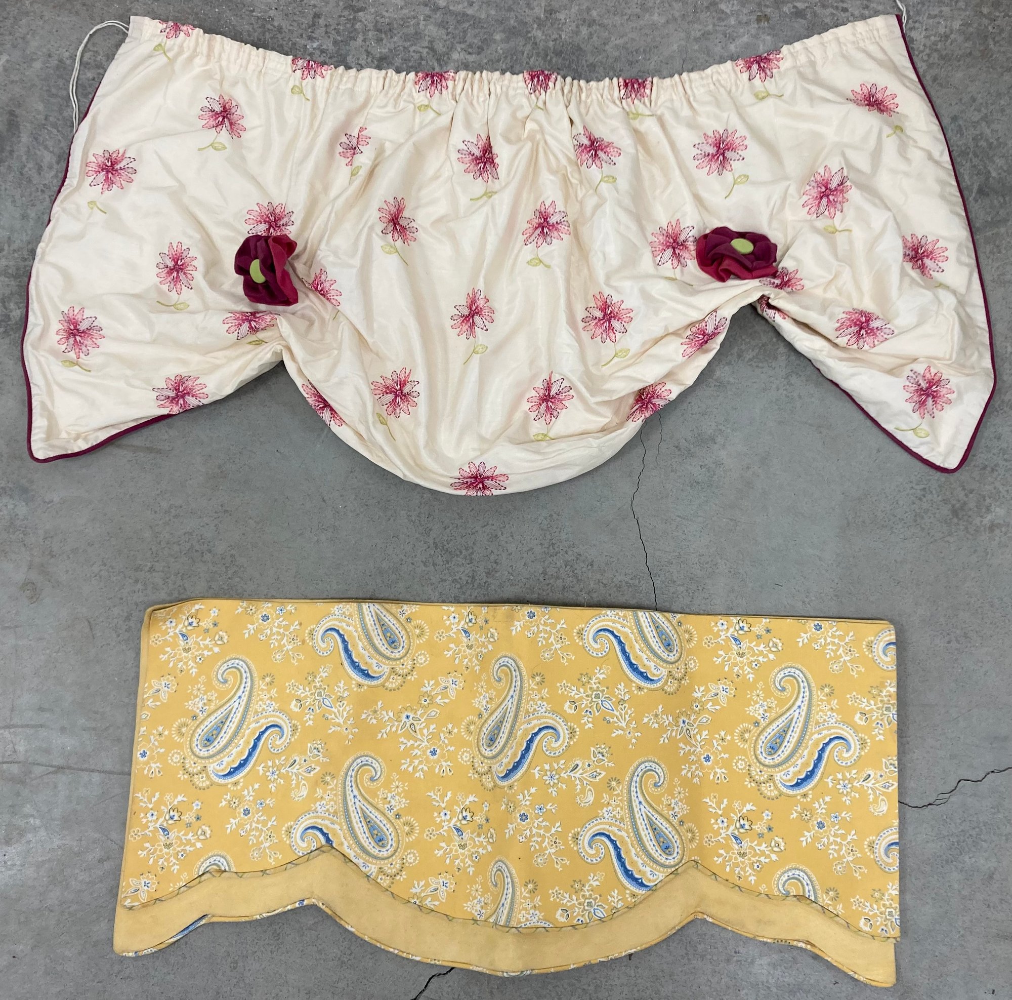 High End Designer Window Valances. Swag dimensions are: 24” tall x 47” wide. Yellow paisley balance dimensions are: 16” tall x 35” wide. Condition: See photos.
