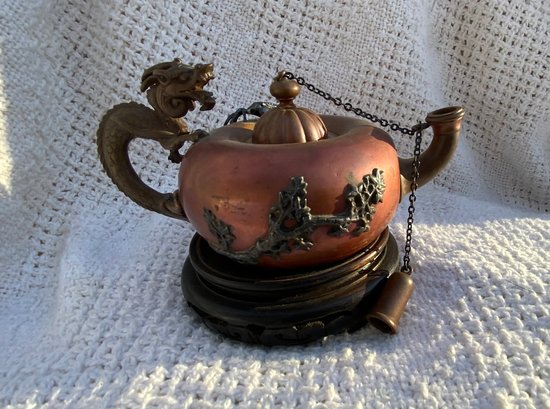 Japanese Mixed Metal Cigar Lighter Tea Kettle Style. Gorham Manufacturing Company. Copper with silver mounts and bronze handle. Good condition.