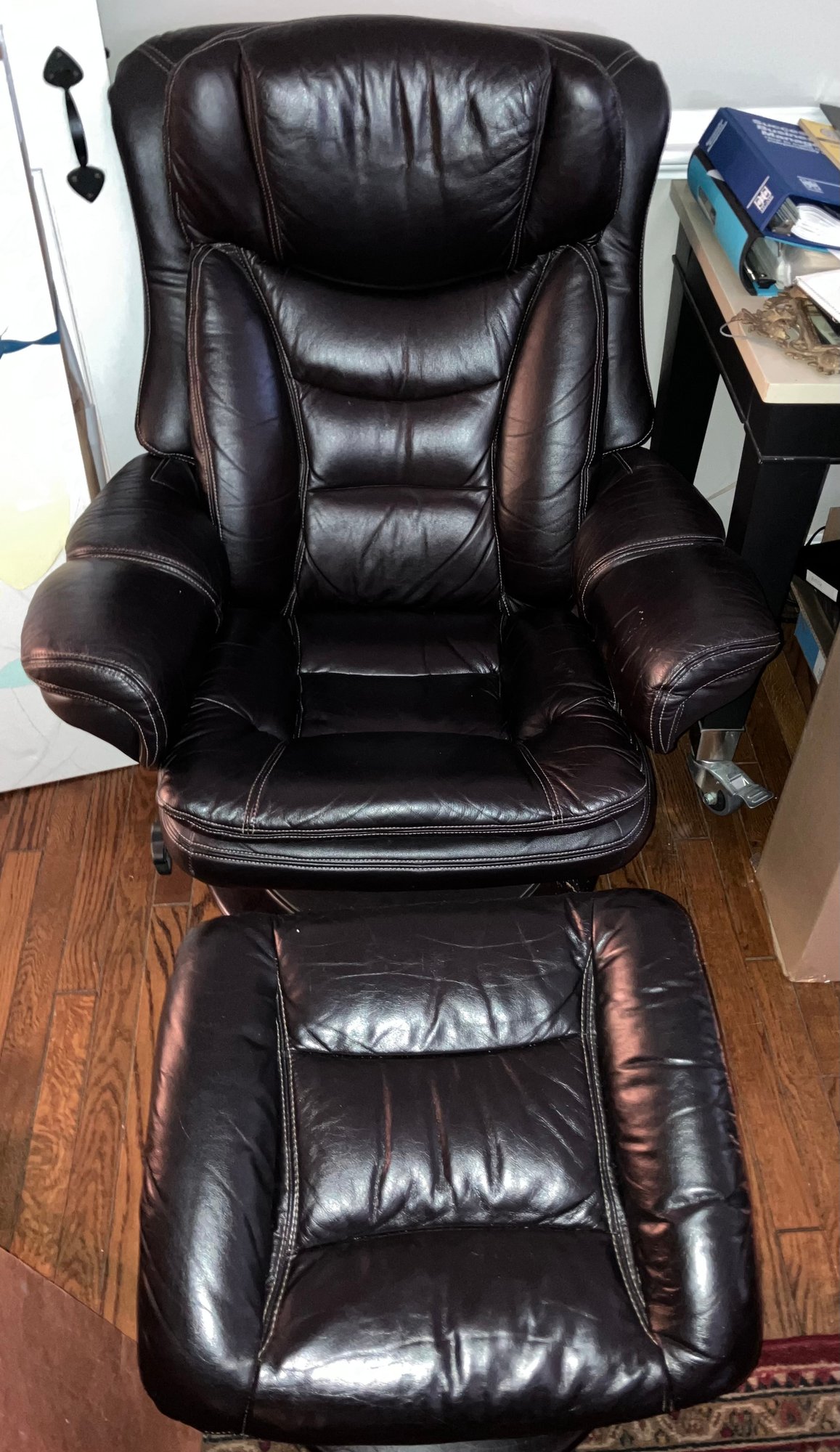 Lane black pleather chair with ottomon. Good condition.