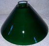 Large Deep Green Student Cased Glass Lamp Shade. Don’t mind the glare of the lights on the underside of the lamp. Dimensions at base: 13 3/4” round. Dimensions: 6 3/4” tall . The hole at the top dimensions are: 2” round. Condition: See photos.