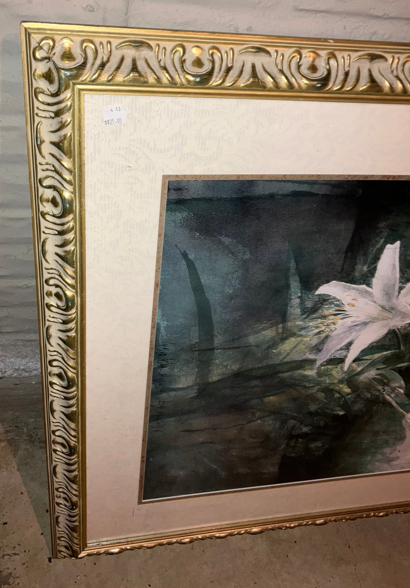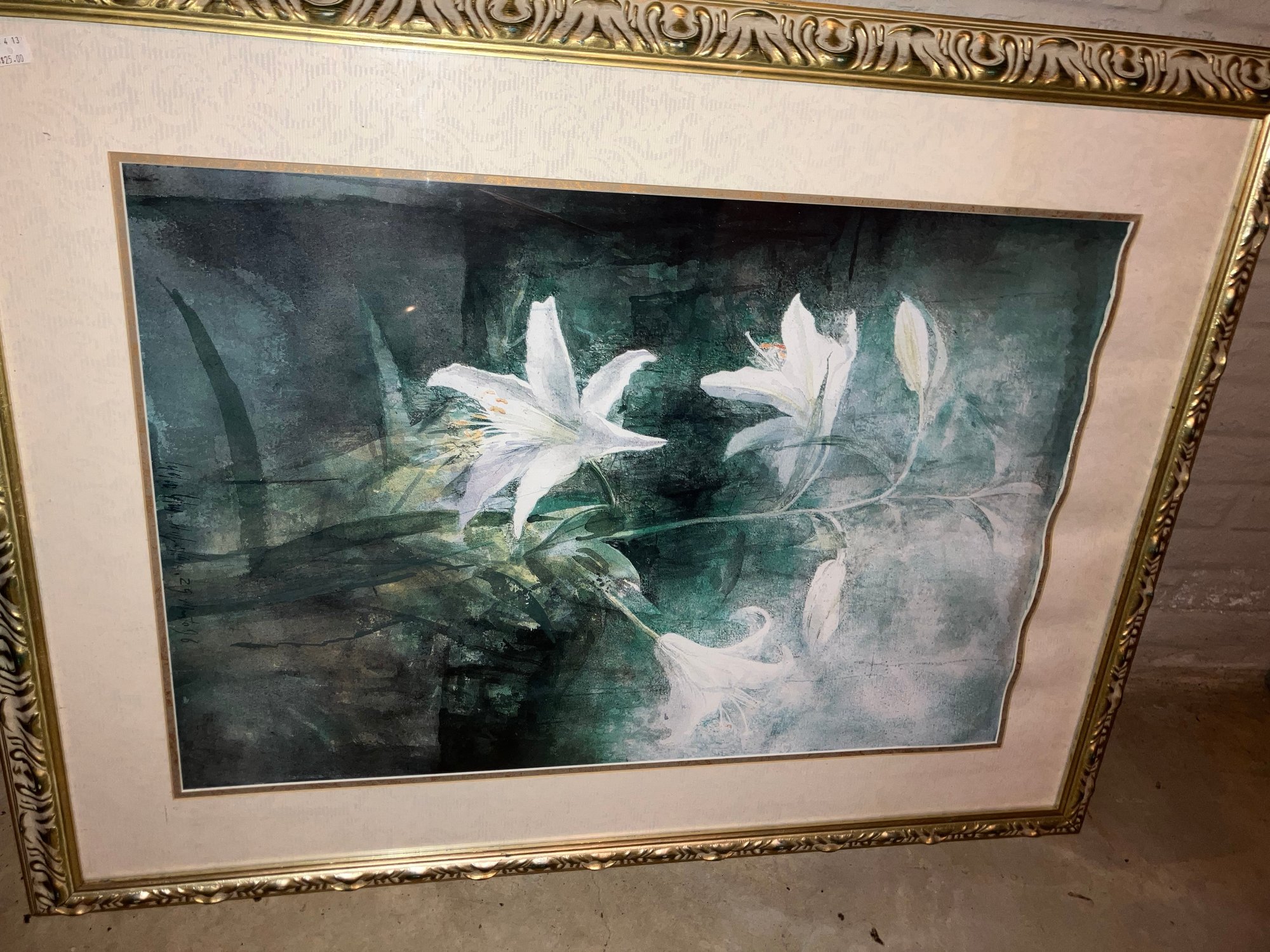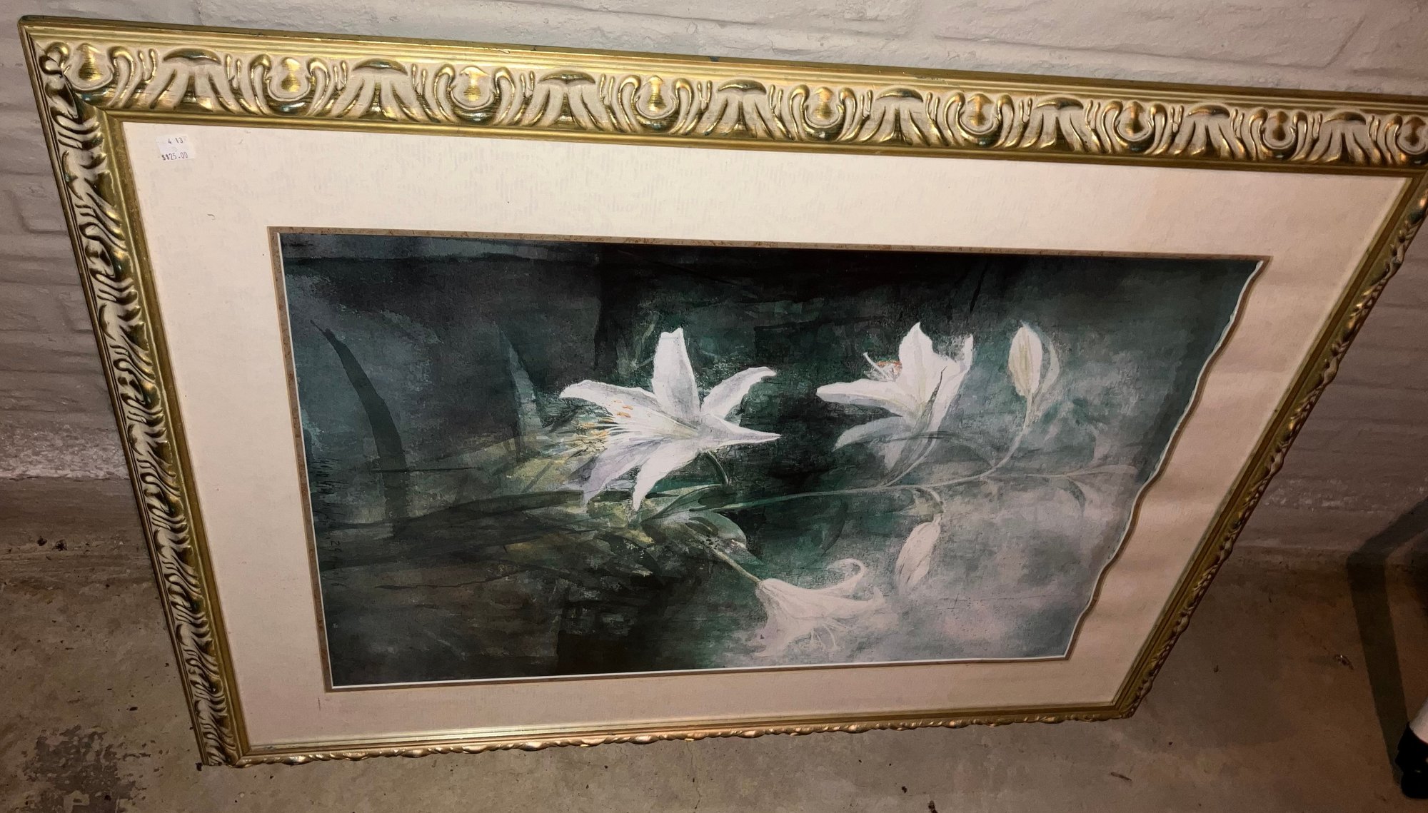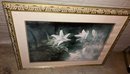 Large framed print. Dimensions: frame: 38” tall x 28 3/4” wide, print dimensions: 28 1/2” tall x 19” wide. Some moisture.