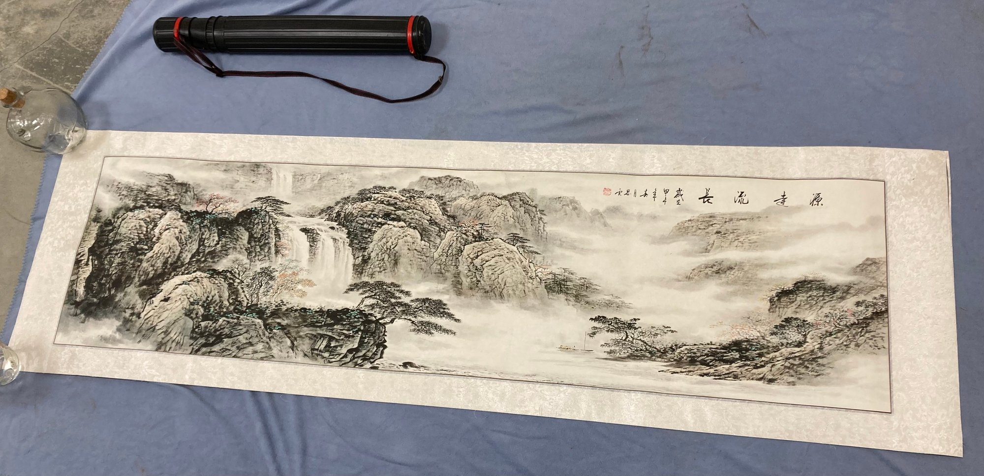 Large Signed Japanese Watercolor On Silk Paper With Hard Case. Very good quality. Dimensions are: 2 1/2” tall x 78” wide. The hard case dimensions are: 25 1/4” tall x 3 1/4” round. Condition: See photos.
