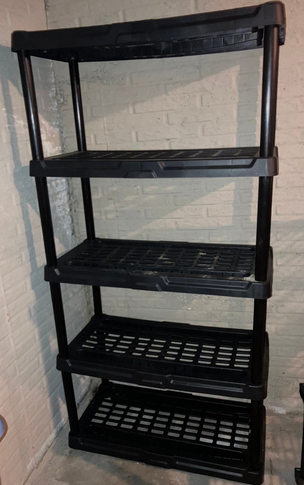 Black plastic shelving unit. Dimensions: 53” tall x 36” wide x 18” wide.