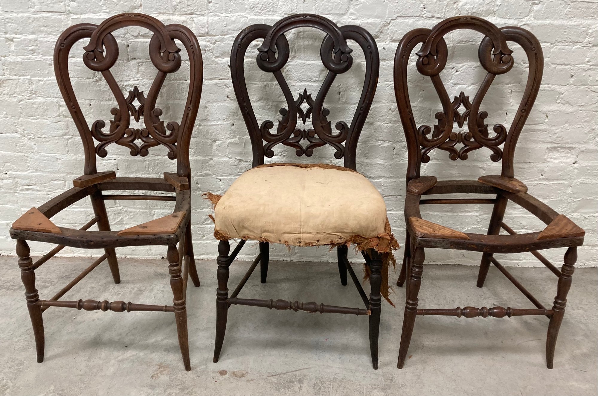 Lot of three balloon back chairs. Made of mahogany. Dimensions are: 33 1/4” tall x 17” wide x 16” deep. One chair has original horsehair. Condition: See photos.