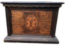 This is a 17th century European armorial box with coat of arms. It has original old hand hammered hinges with rose head nails. The box is made of mixed woods and has a molded platform and a beaded lift top. The center of the box is inlayed with a family Armorial crest. It is in overall good condition considering its age. It does have scuffs and abrasions in accordance to its age. There are some worm holes but they are not active and have died a long time ago. There is a slight cup to the lid. The dimensions are: 21" tall x 29" wide x 17 1/2" deep.