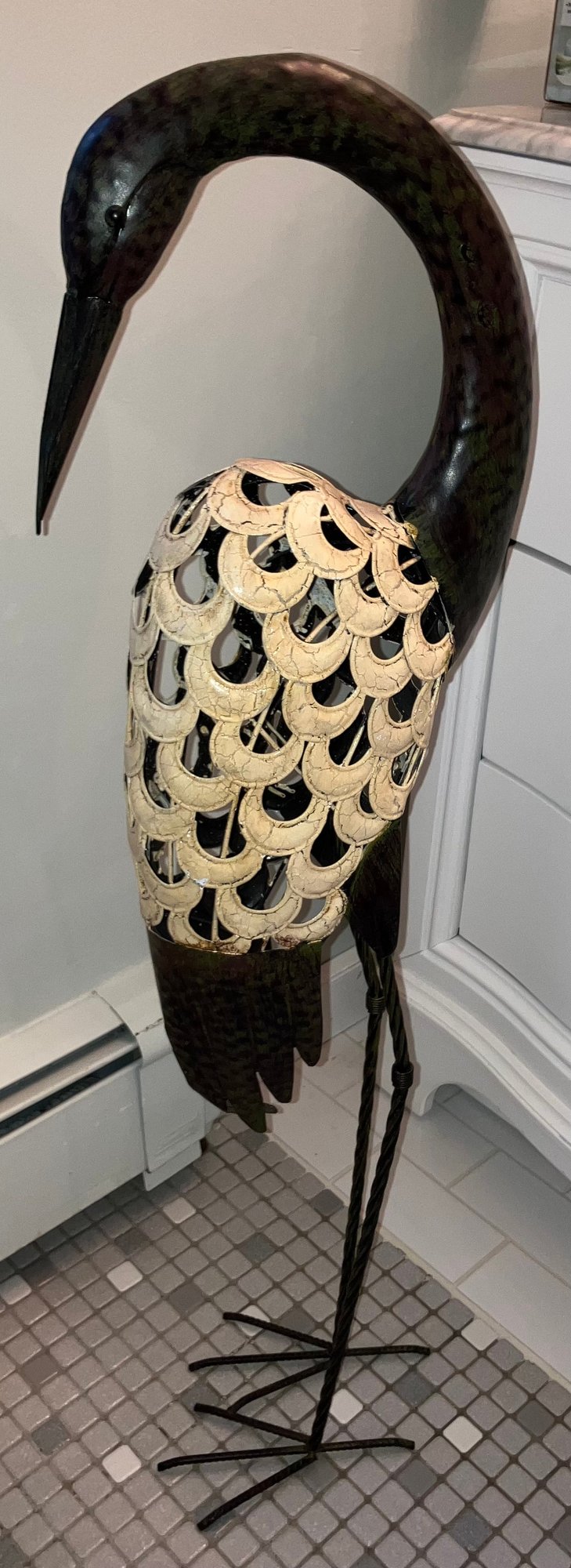 Art sculpture of a bird. Made of lightweight metal. Dimensions: 38 1/4” tall x 11” wide. Good condition.
