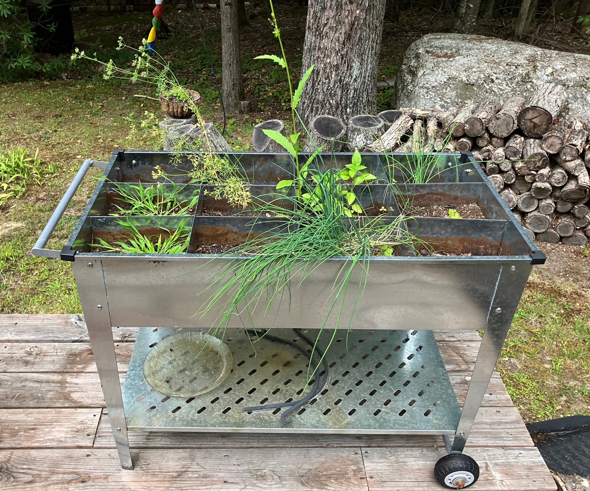 Metal plant stand on wheels. Dimensions: 31 1/2” tall x 43” wide x 20 1/4” deep. Good condition.