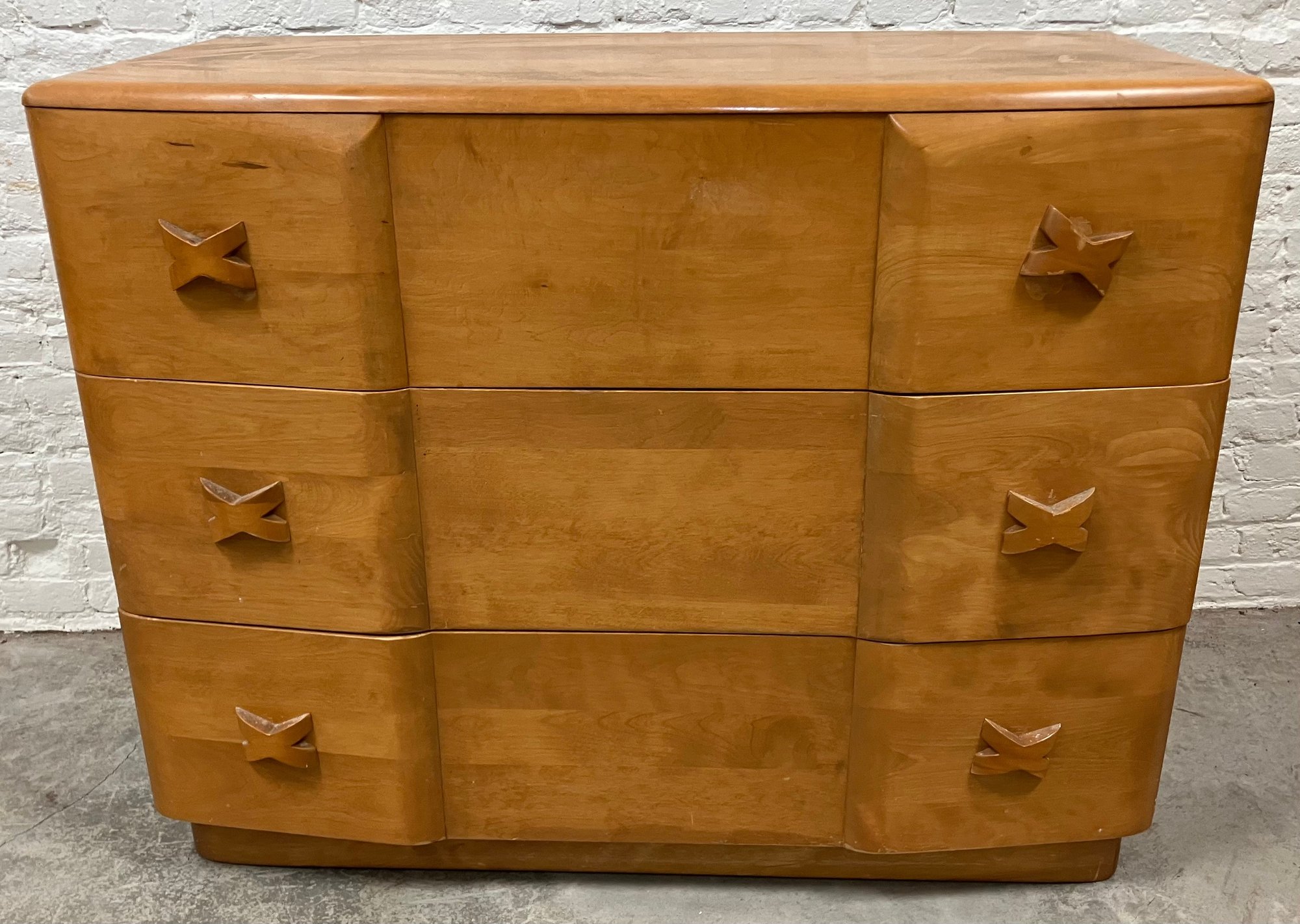 Mid Century Modern Heywood Wakefield dresser. MCM. Some wear to the finish. (See photos). There is an original wooden mirror frame without the glass that is also part of this dresser. There are other matching pieces also up for auction. Good condition. Dimensions are: 33 1/2” tall x 42” wide x 19” deep.