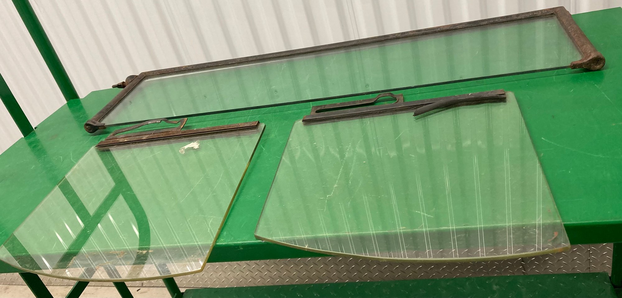 Model A Ford Windshield & Side Windows. Dimensions of front mirror: 10” tall x 37” wide. Side mirror dimensions: 13 1/2” tall x 14” wide. Fair condition.