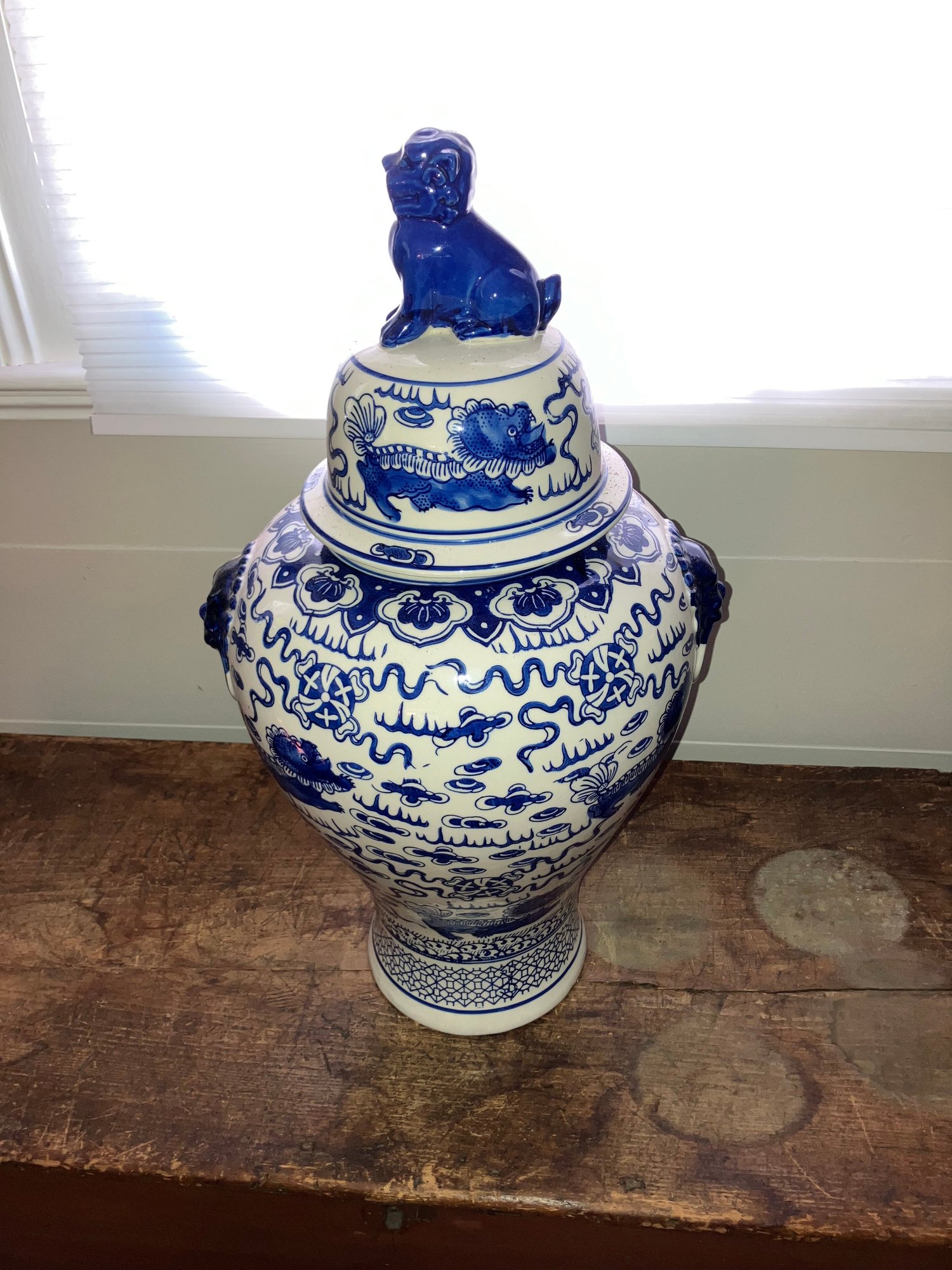 Modern Asian porcelain blue & white vase with lid. Dimensions: 25” tall x 12” wide. Good condition.