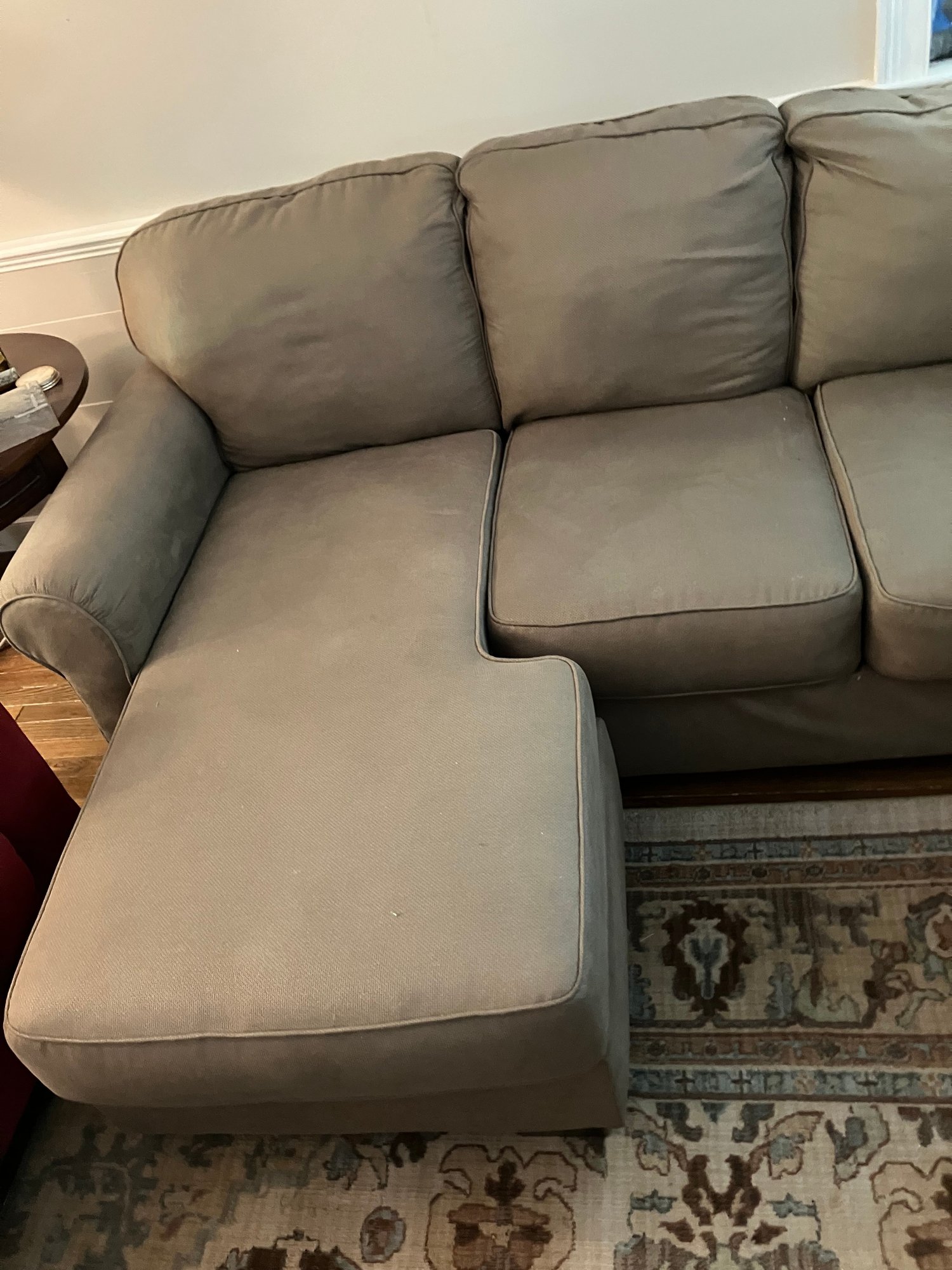 Modern sofa with chaise. Dimensions: 31” tall x 83” wide x 37” deep, 61” deep with chaise. Good condition.