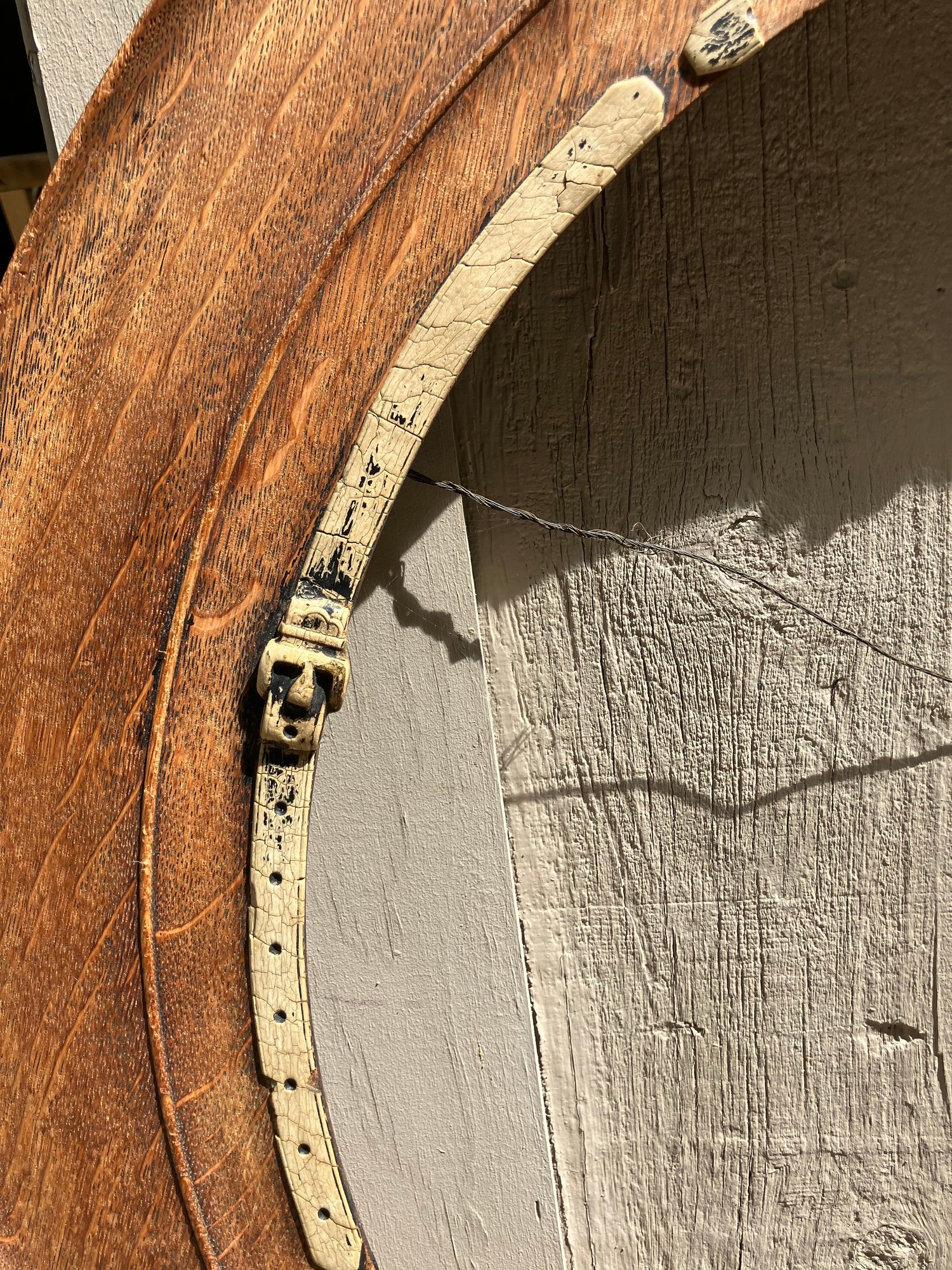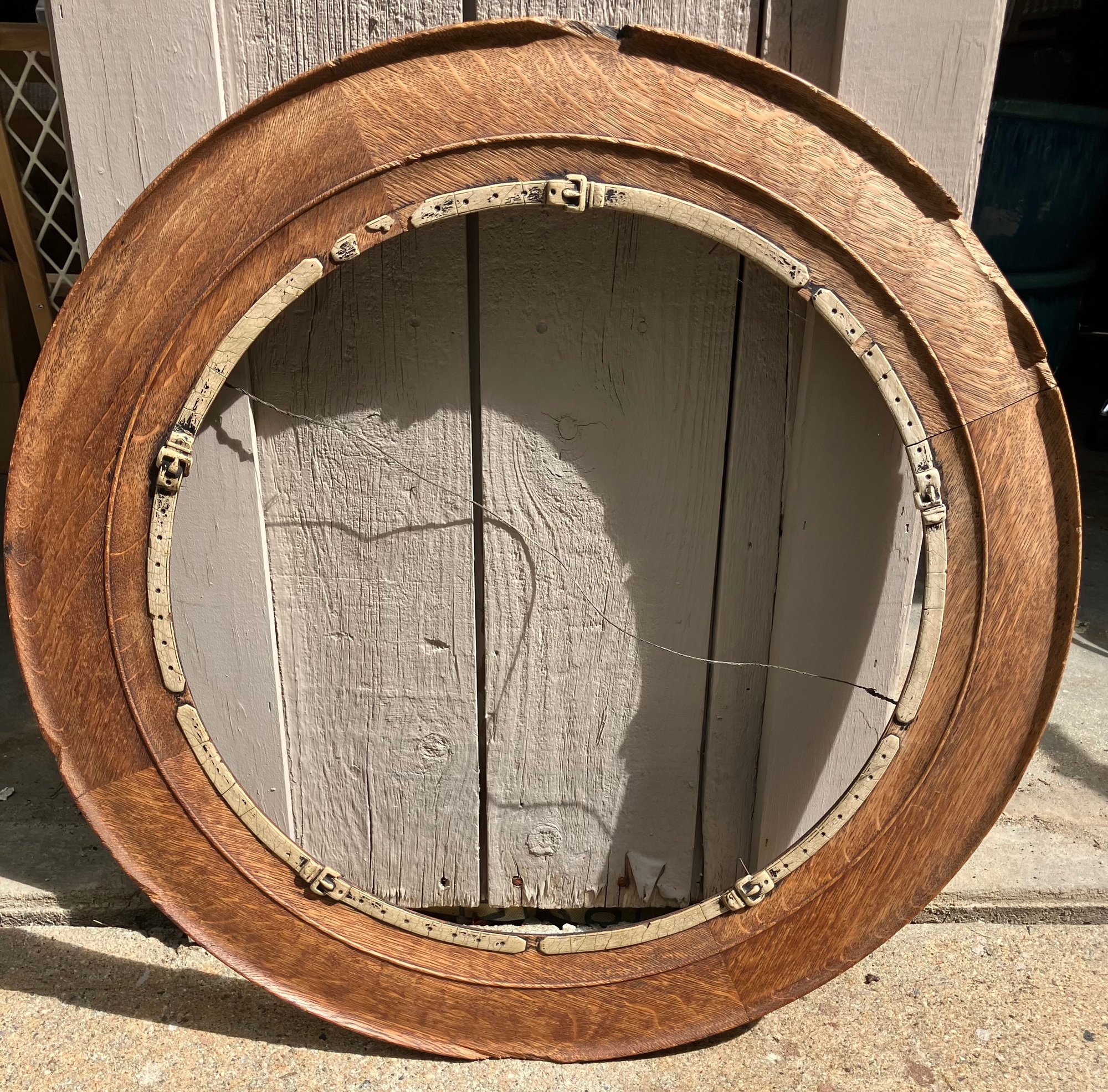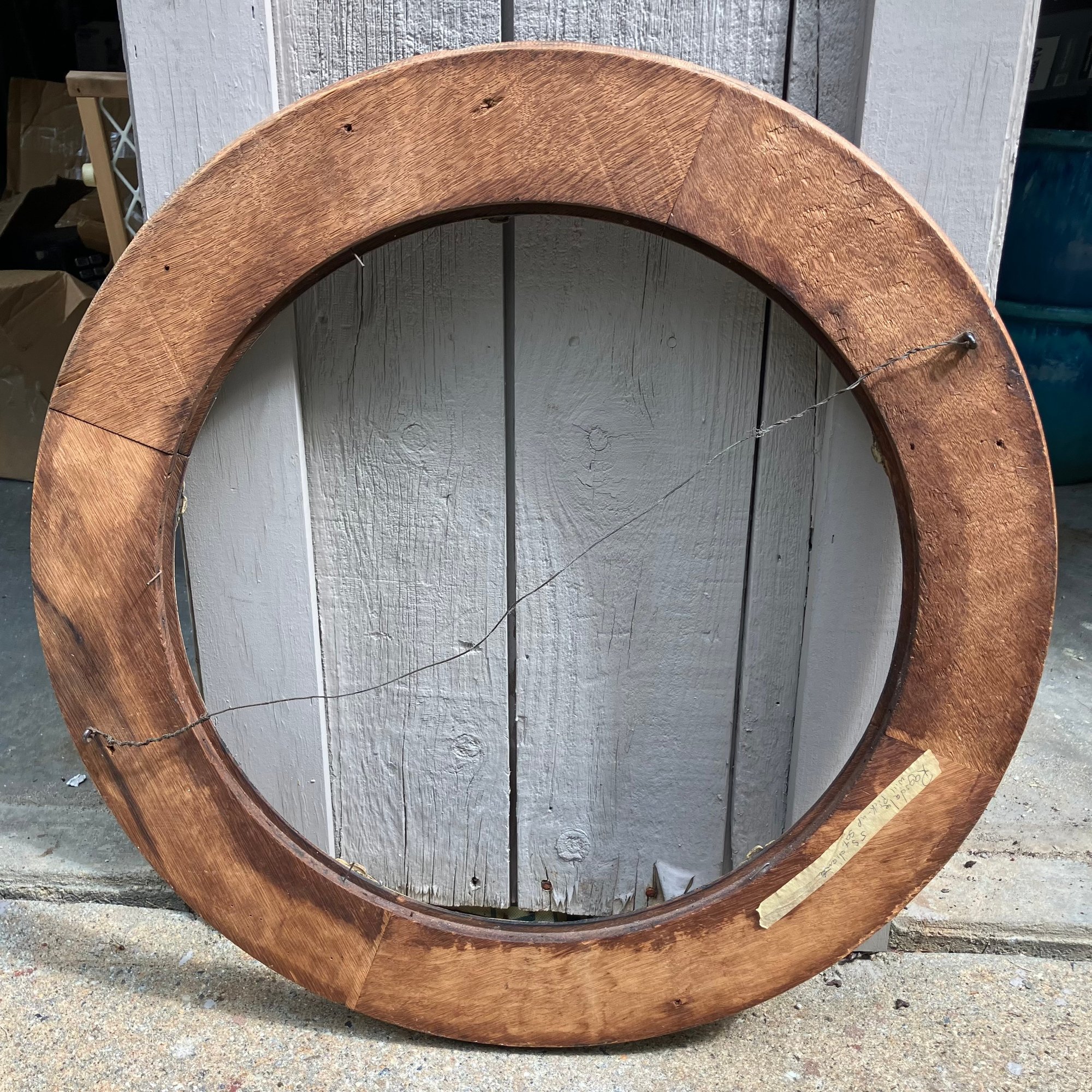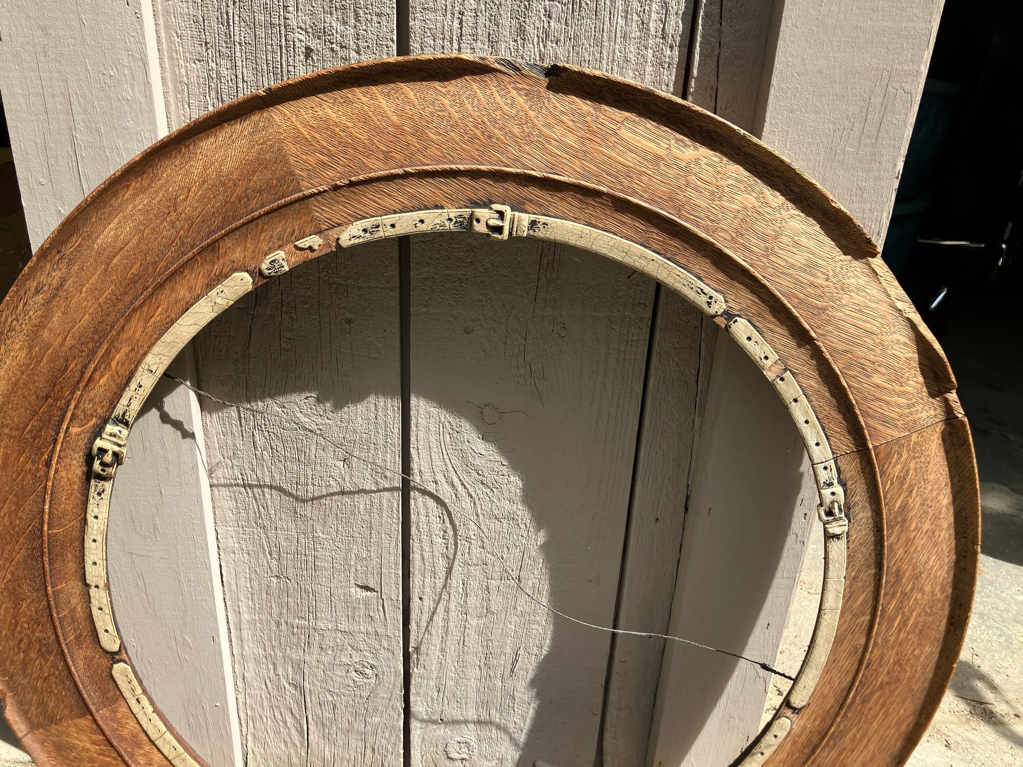 Oak wooden horse picture frame. Dimensions: 28” round. Inner dimensions: 19 1/2” round. Fair condition.