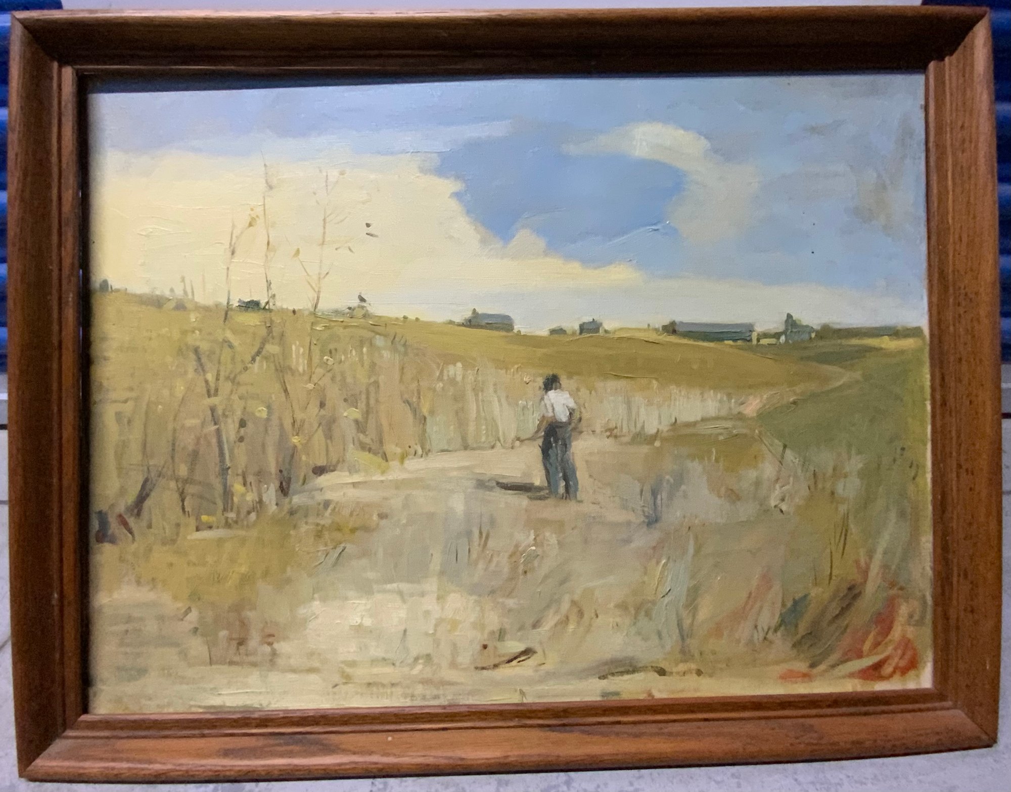 Oil On Canvas Man In Field. Dimensions are: 20” tall x 26” wide. Good condition.
