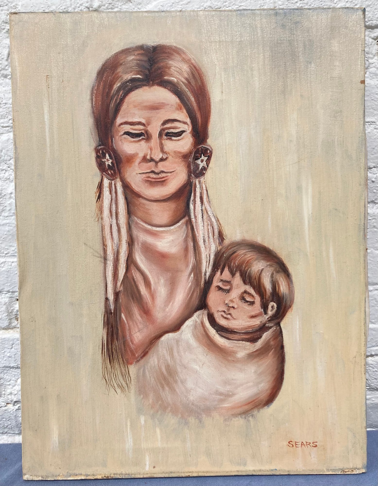 Oil on canvas signed by Pauline Sears. Scene of woman and child. Dimensions are: 24” tall x 18” wide. Condition: See photos.