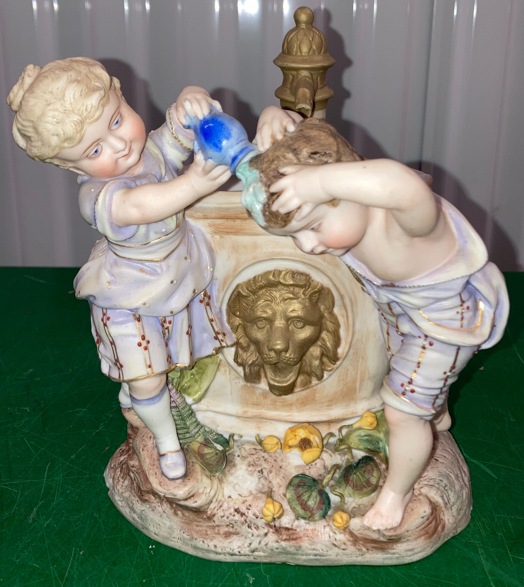 Porcelain Girl Washing Boys Hair. Dimensions are: 7 1/2” tall x 7 1/2” wide. Two small chips. Fair condition.