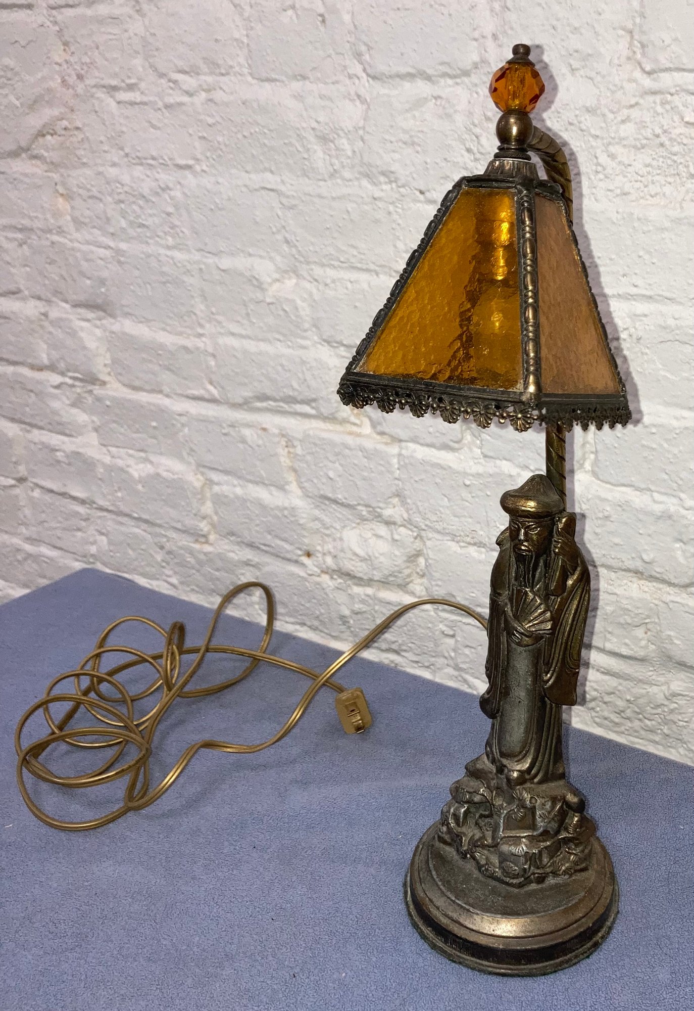 Oriental motif lamp with amber shade. Dimensions are: 16” tall x 4 1/4” round at base. Condition: See photos.