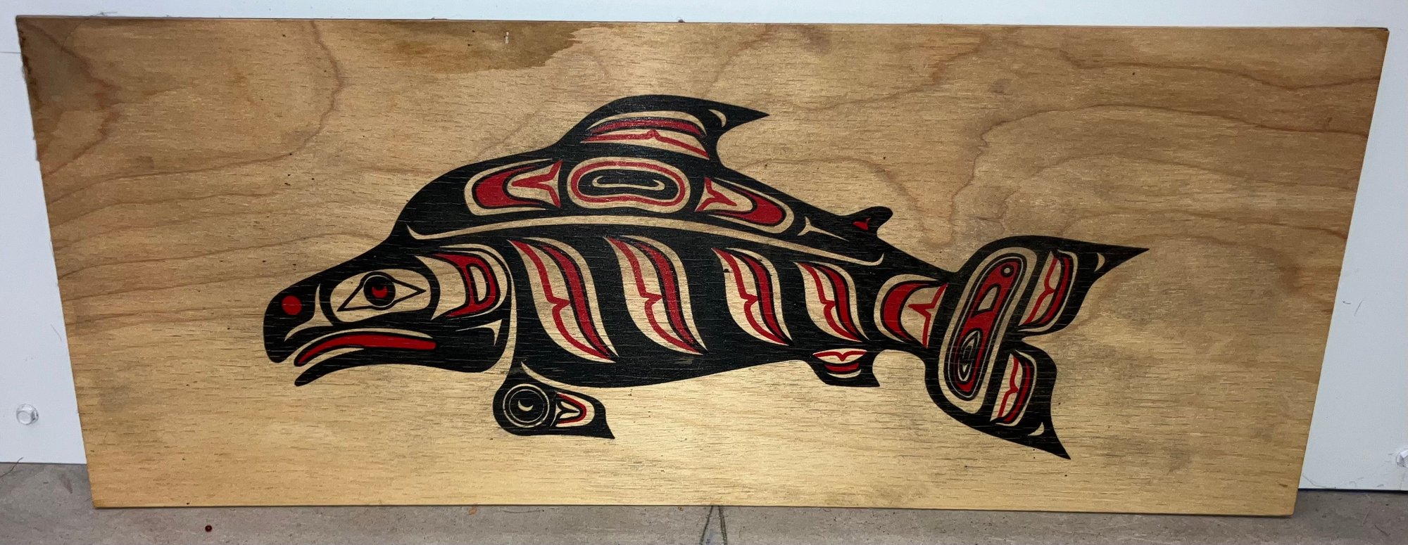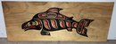 Depicting a killer whale. Appears to be silkscreen on wood. 18 1/2” long x 7” wide.