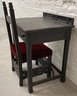 Gothic fumed oak desk and chair. Fumed quarter-sawn oak with Gothic embellishments. Dimensions are: 32” tall x 28 1/2” wide x 21” deep. Chair dimensions: 37 1/2” tall x 16” wide x 17 1/4” deep. Condition: There is a split on the top of the desk. See photos.