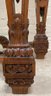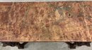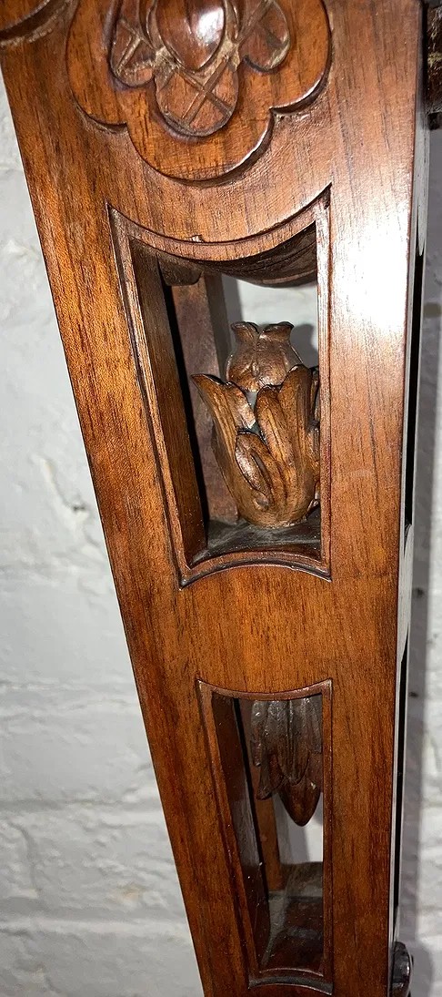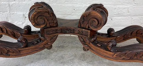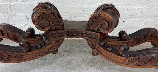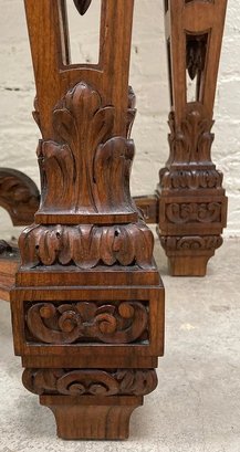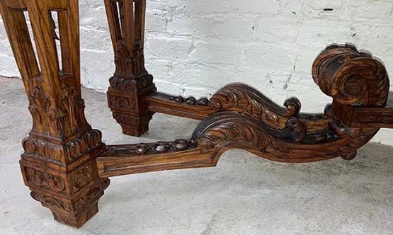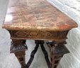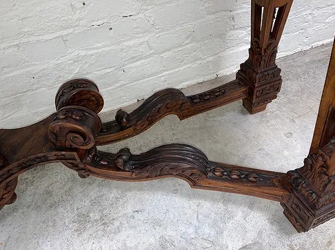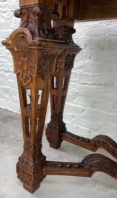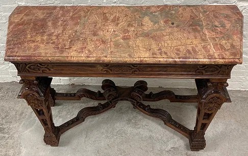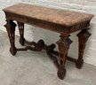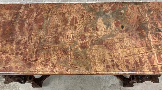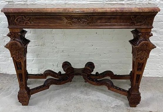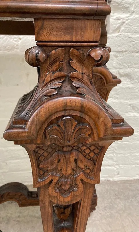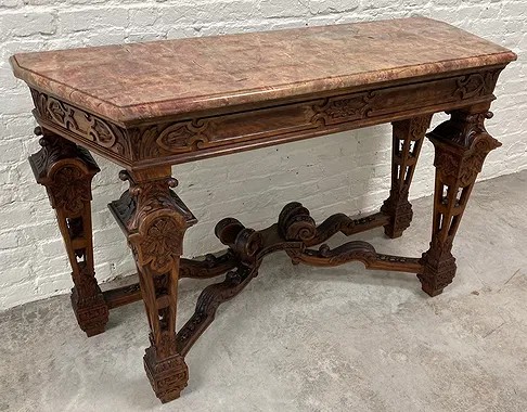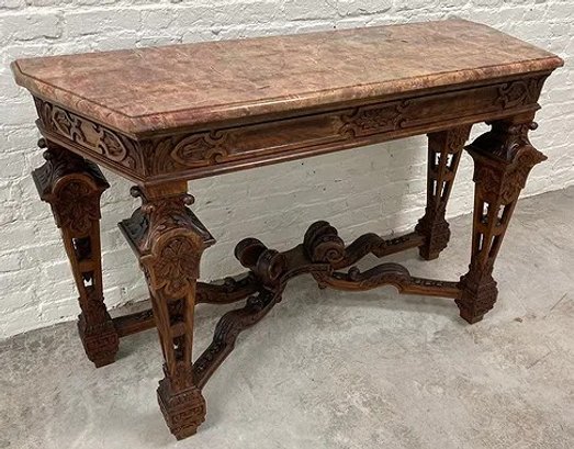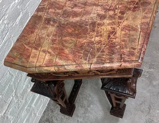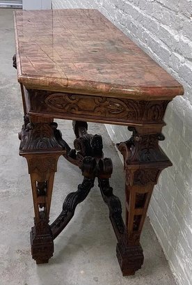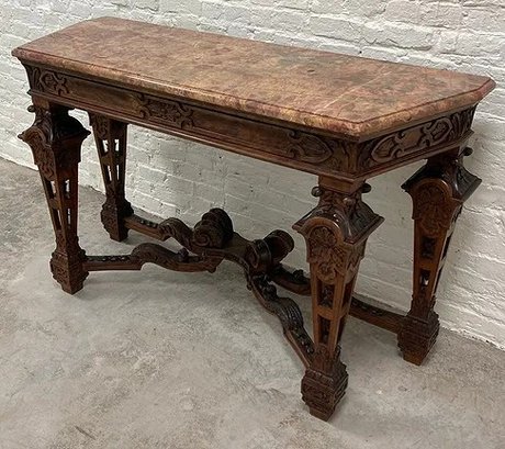 Gothic/Renaissance Revival Walnut Marble Top Console TableExceptionally designed and executed black walnut console table with highly figured red grained marble. This table is extremely well made and seems to be a combination of several styles. It is highly carved. The legs are pierced carved with flame finials on the inside. The skirt and the legs are intricately carved. Overall condition of the table is excellent and extremely sturdy. Dimensions are: 30 1/4” tall x 48 1/4” wide x 20” deep.Condition: All original, excellent and sturdy.