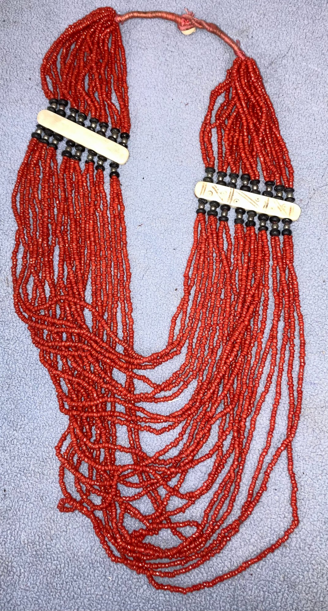 Red Beaded Necklace With carved bone. Dimensions are: 13” long. Condition: See photos.
