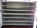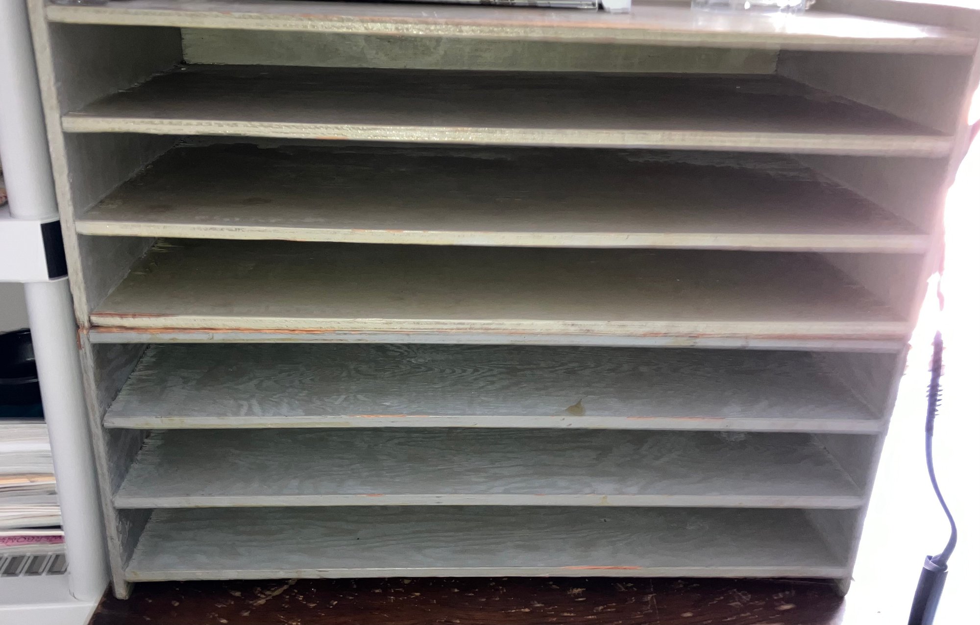 Grey wooden shelving unit. Dimensions: 24” tall x 31” wide x 16” deep. Fair to good condition.