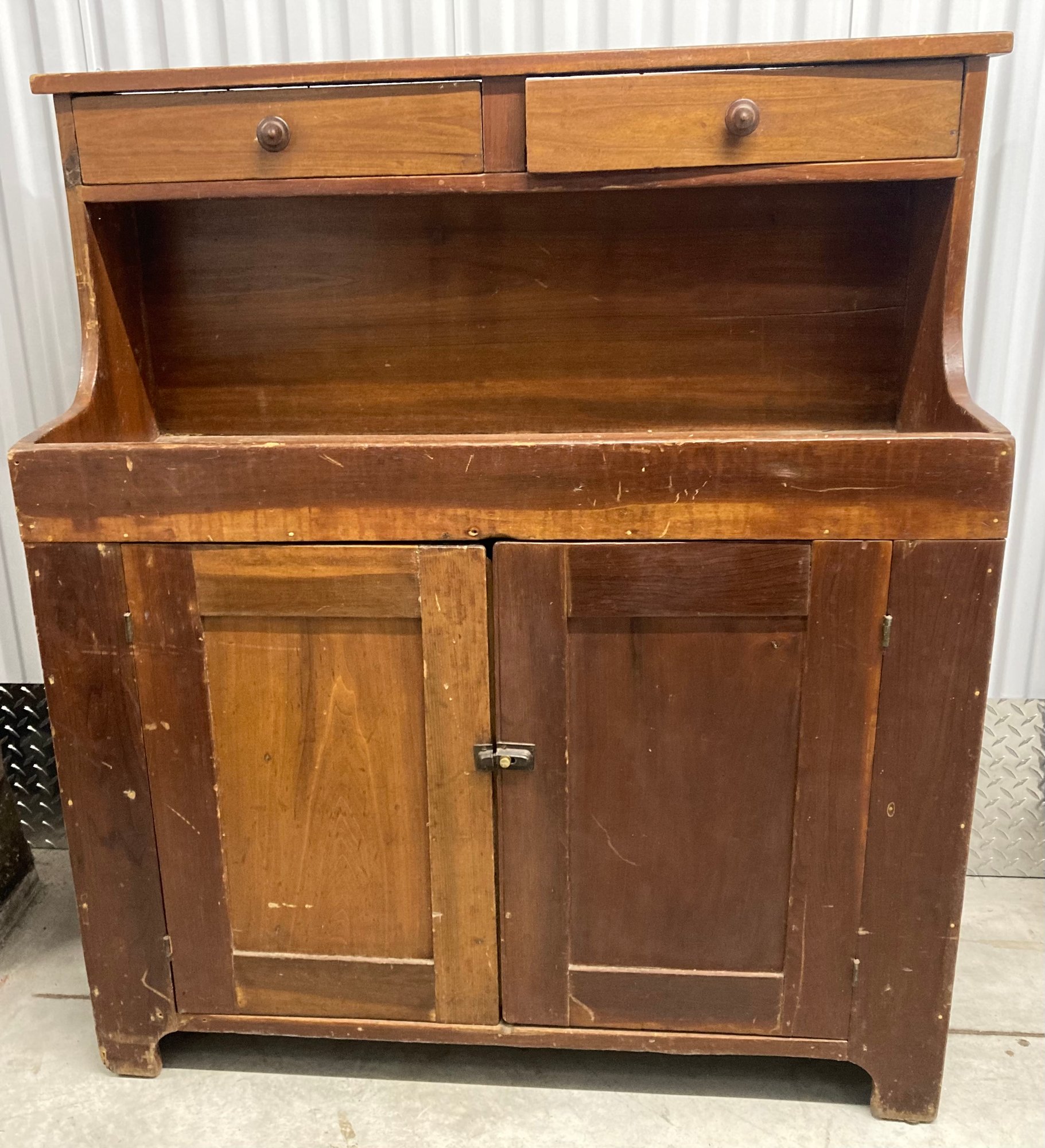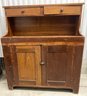 Primitive Two Drawer Hutch. Dimensions are: 47” tall x 41” wide x 17” deep. Fair to good condition.