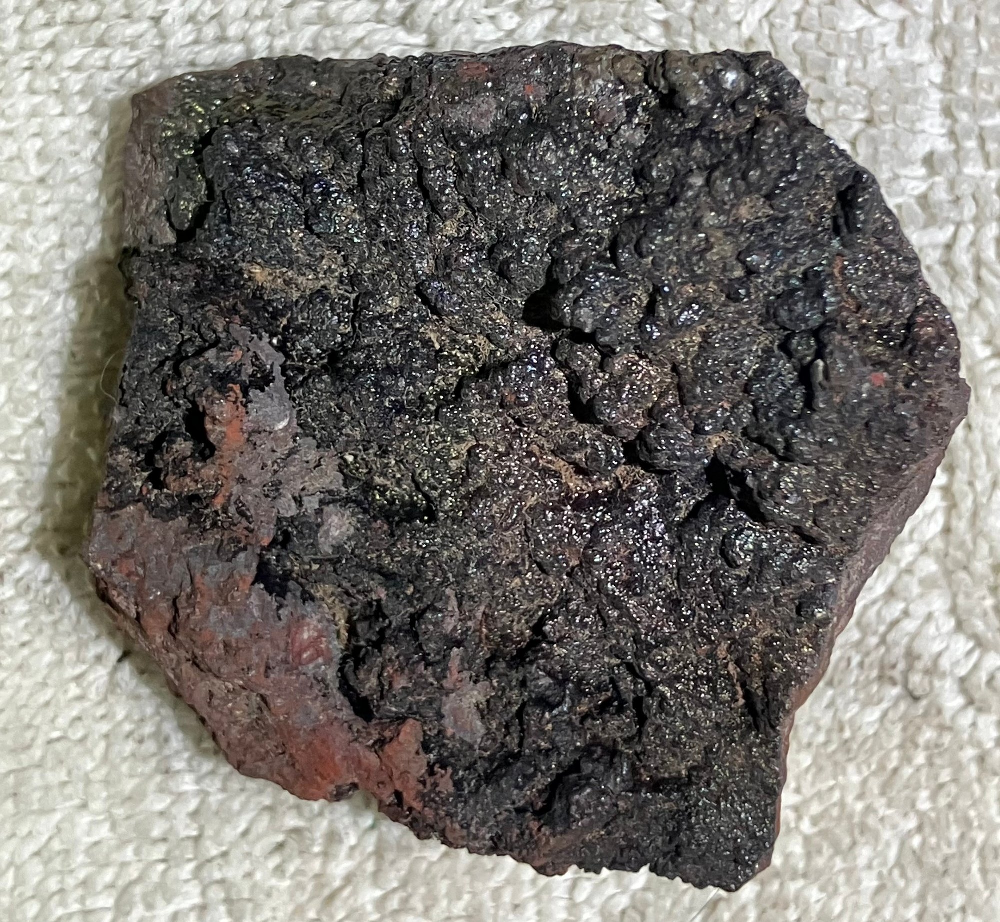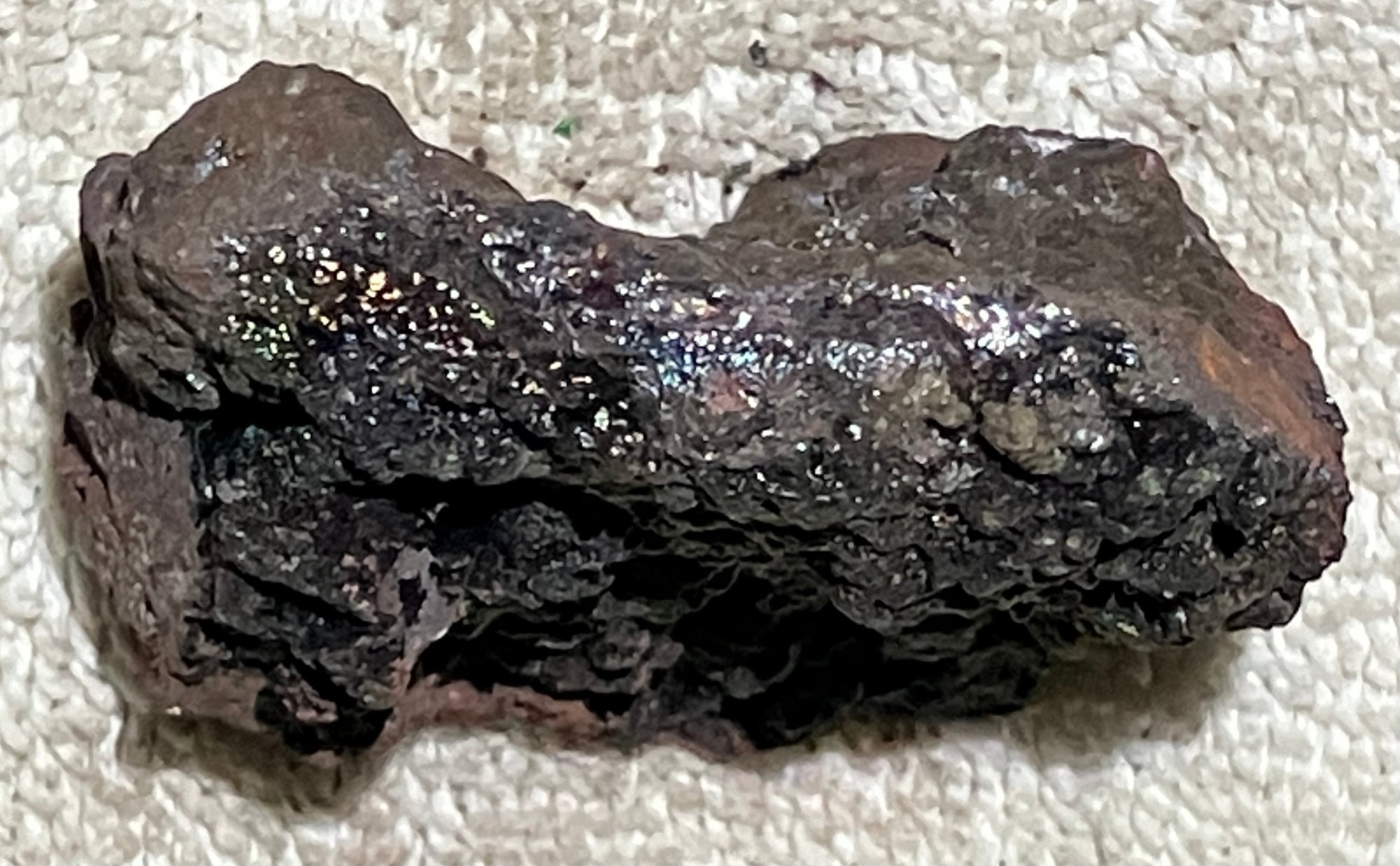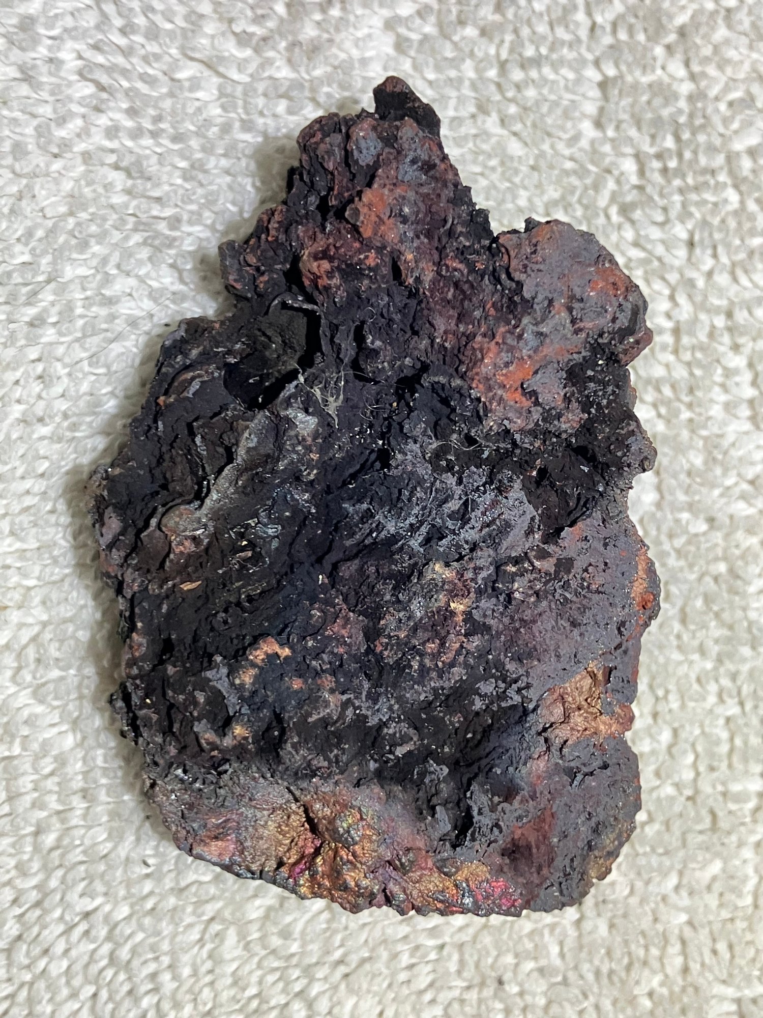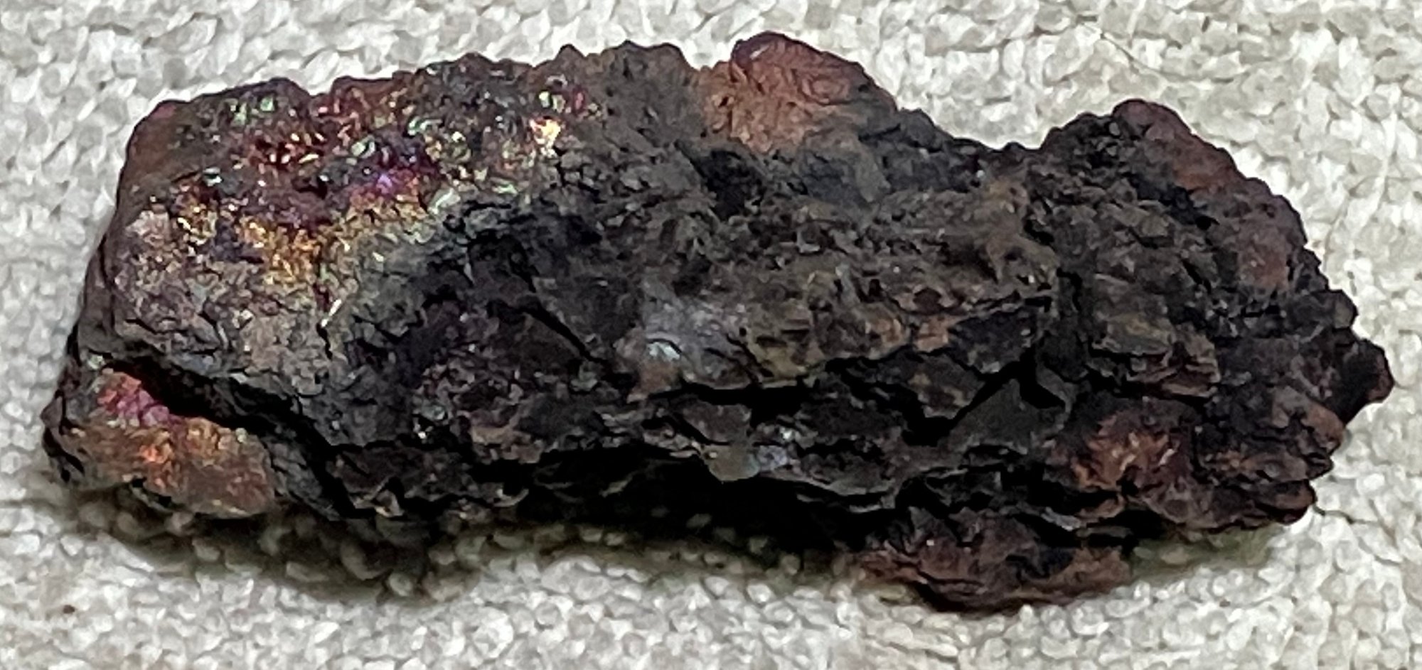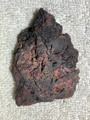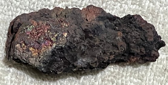 Natural Iron ore, not slag. Some iridescence.