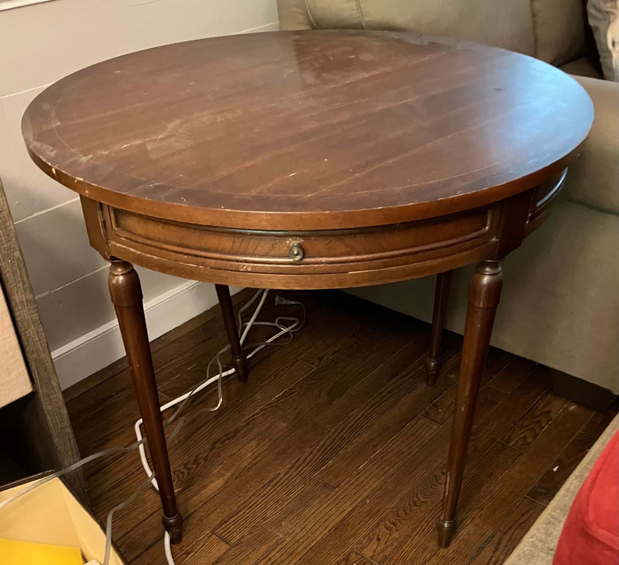 Round mahogany table with drawer. Dimensions: 18” tall x 32 3/4” round. Fair to good condition.