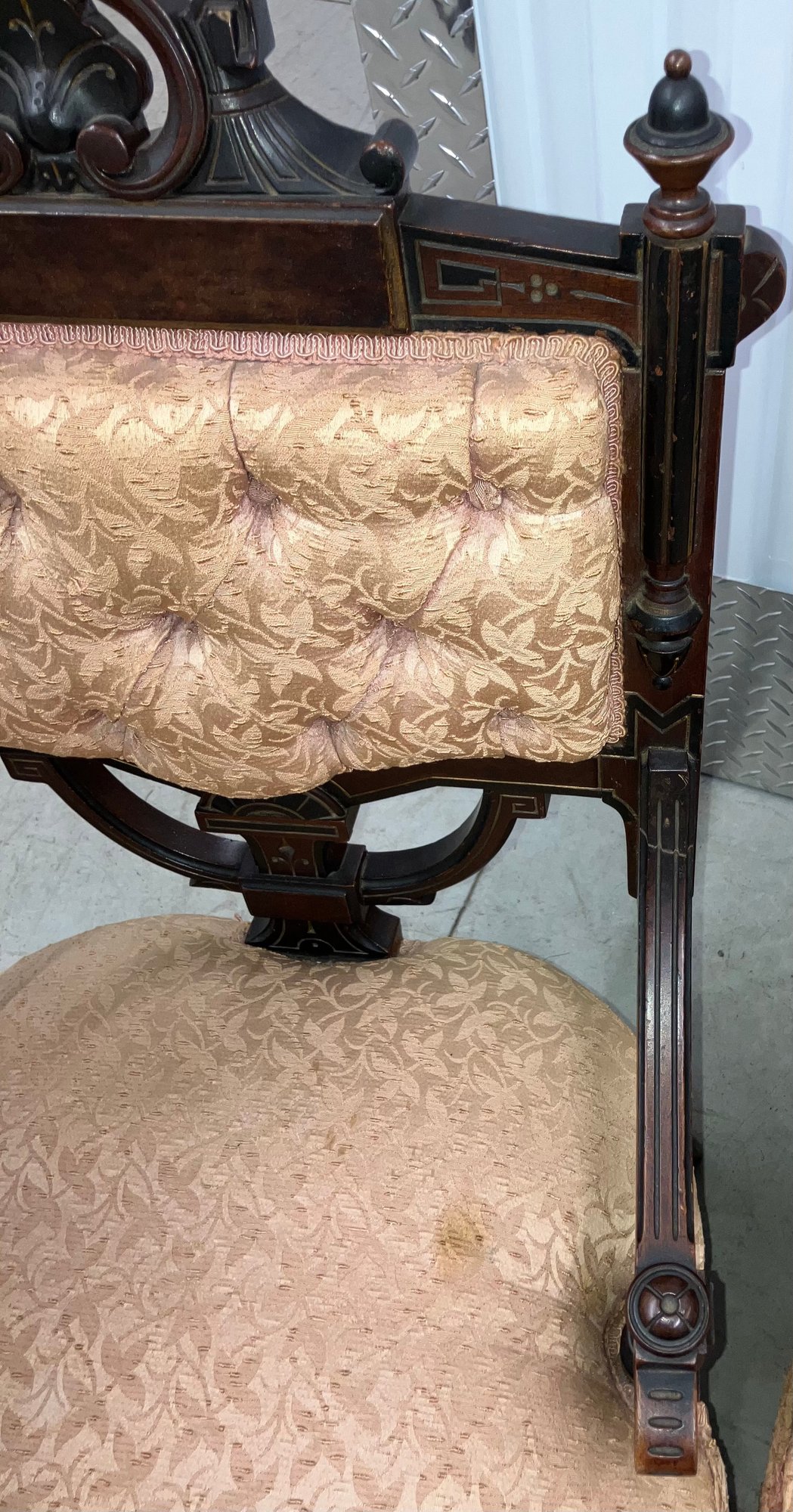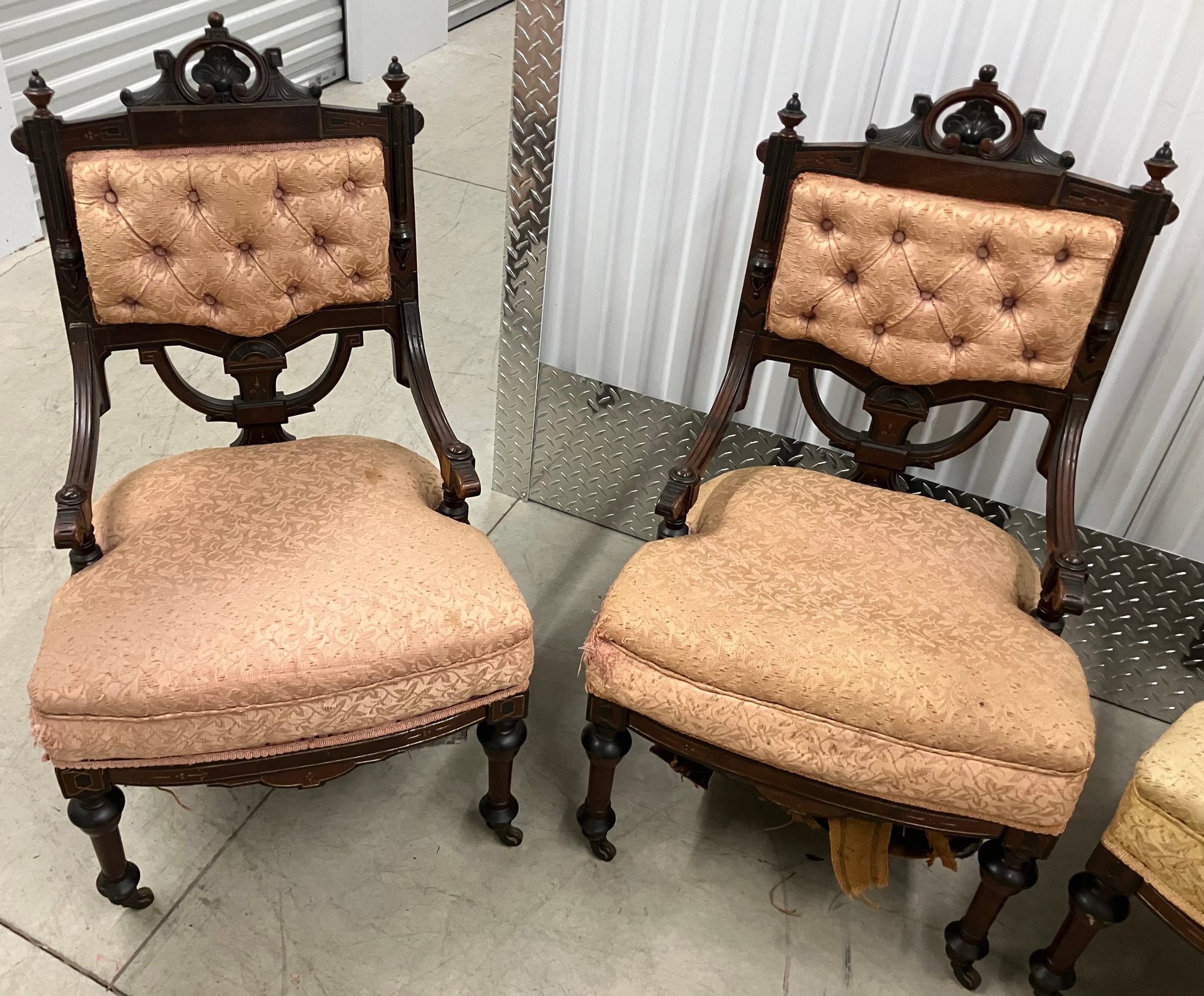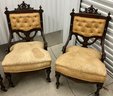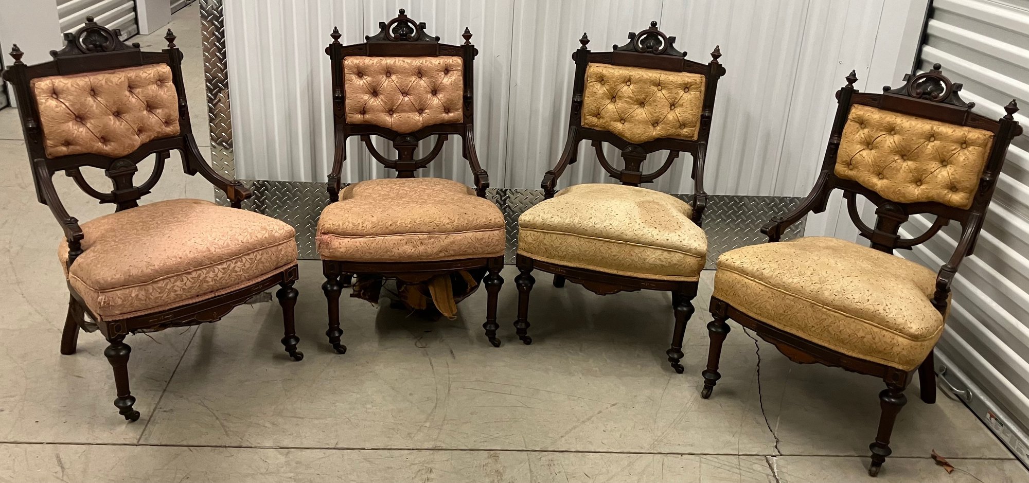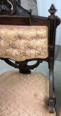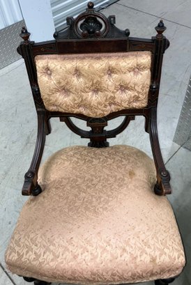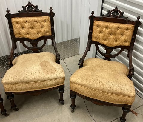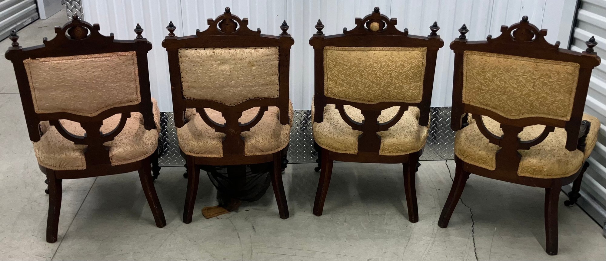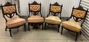 Set of four Victorian chairs. Upholstered is a damask fabric. The chairs are solid and sturdy. The dimensions are: 37 1/2” tall x 24” wide x 22” deep. There is a matching three piece set also up for auction.