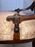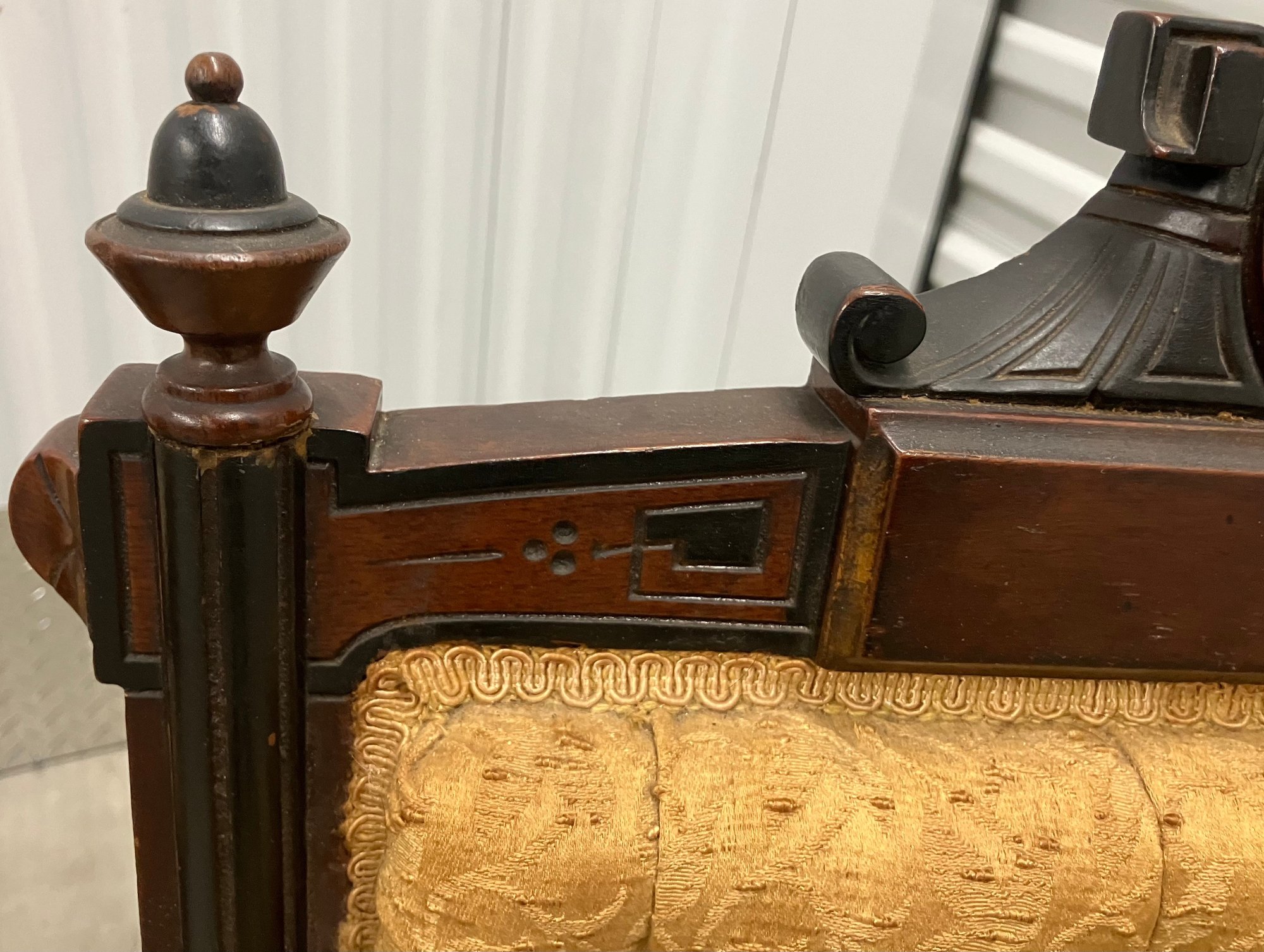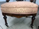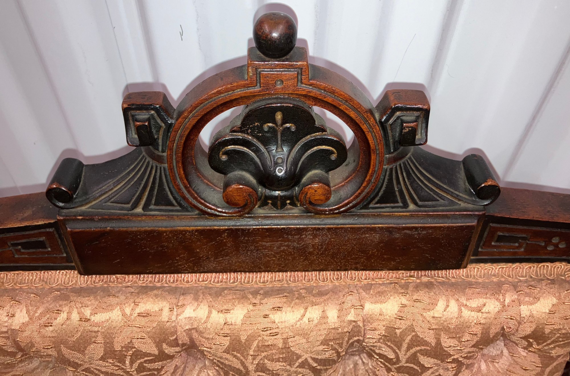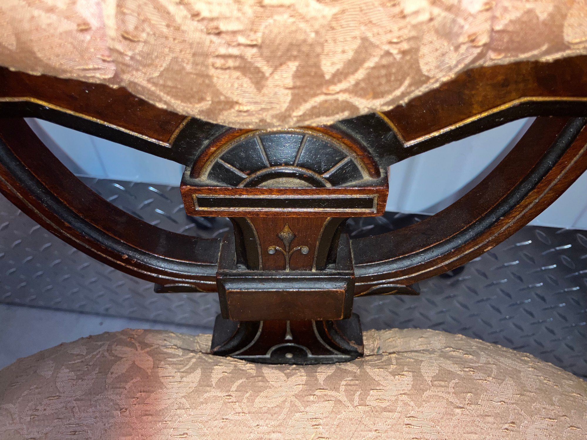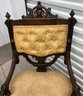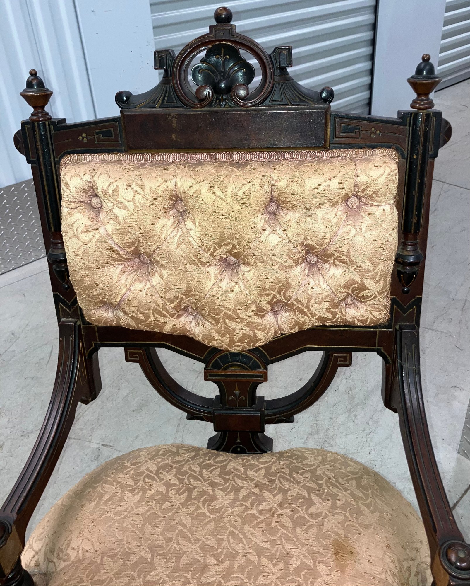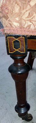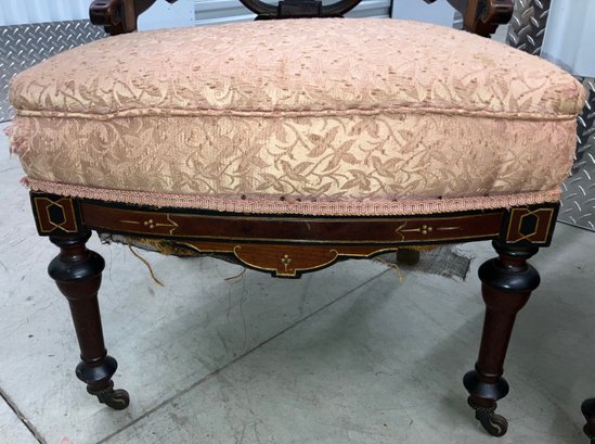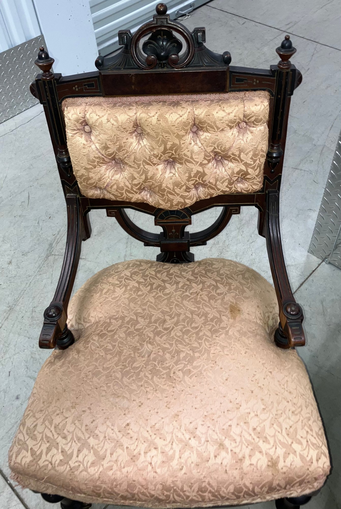 Set of four Victorian chairs. Upholstered is a damask fabric. The chairs are solid and sturdy. The dimensions are: 37 1/2” tall x 24” wide x 22” deep. There is a matching three piece set also up for auction.